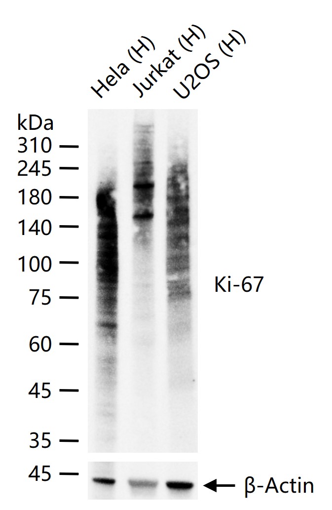25 ug total protein per lane of various lysates (see on figure) probed with Ki-67 monoclonal antibody, unconjugated (bsm-52455R) at 1:1000 dilution and 4°C overnight incubation. Followed by conjugated secondary antibody incubation at r.t. for 60 min.