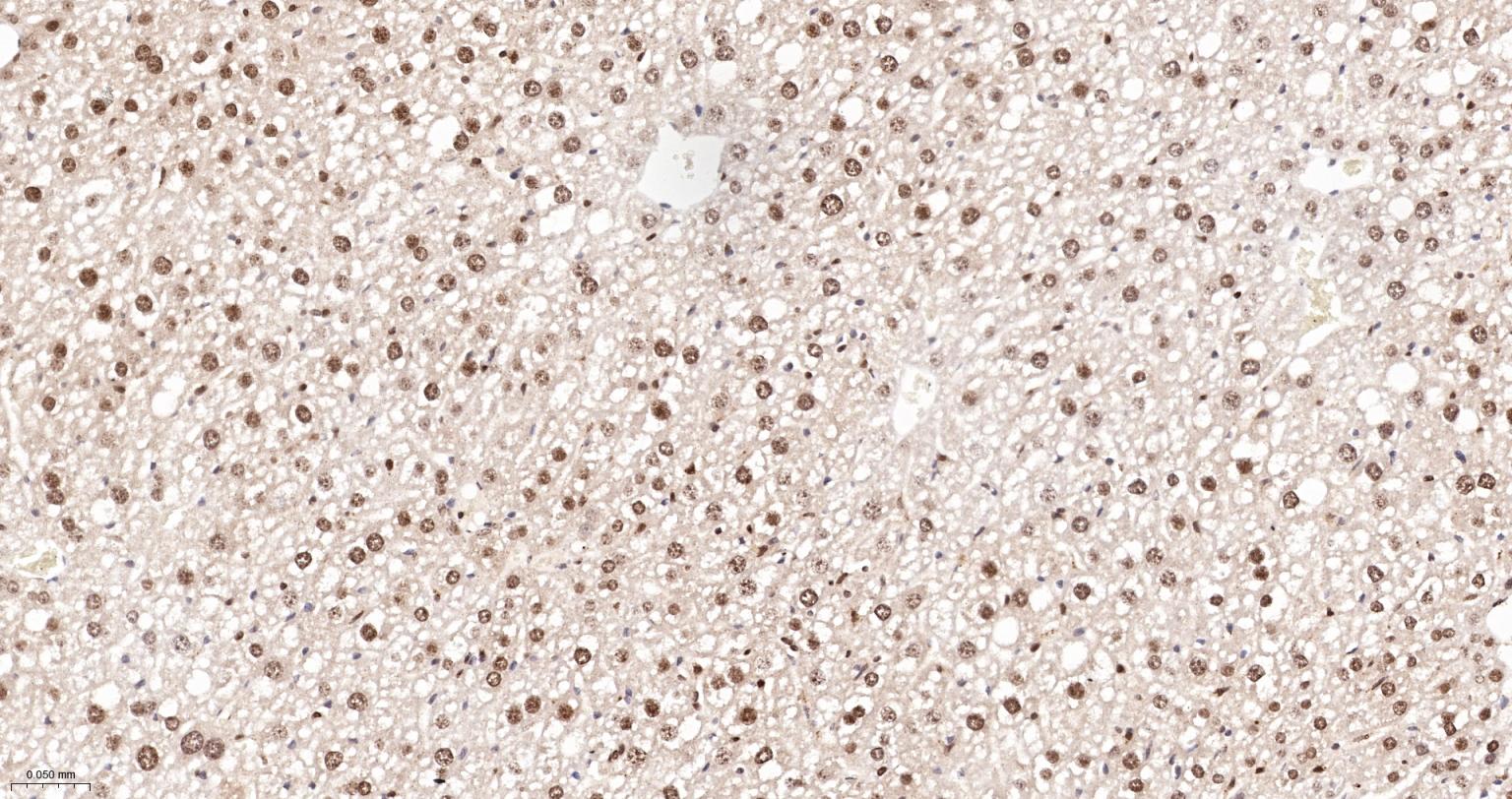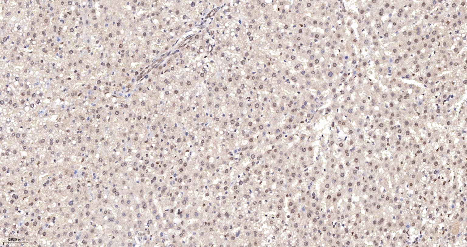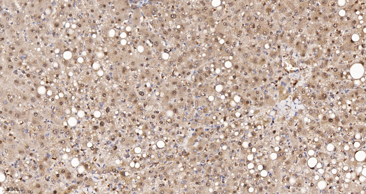 Paraformaldehyde-fixed, paraffin embedded Rat Liver; Antigen retrieval by boiling in sodium citrate buffer (pH6.0) for 15 min; The section was incubated with APEX1 Monoclonal Antibody, Unconjugated (bsm-60707R) at 1:200 overnight at 4°C, followed by conjugation to the bs-0295G-HRP and DAB (C-0010) staining.