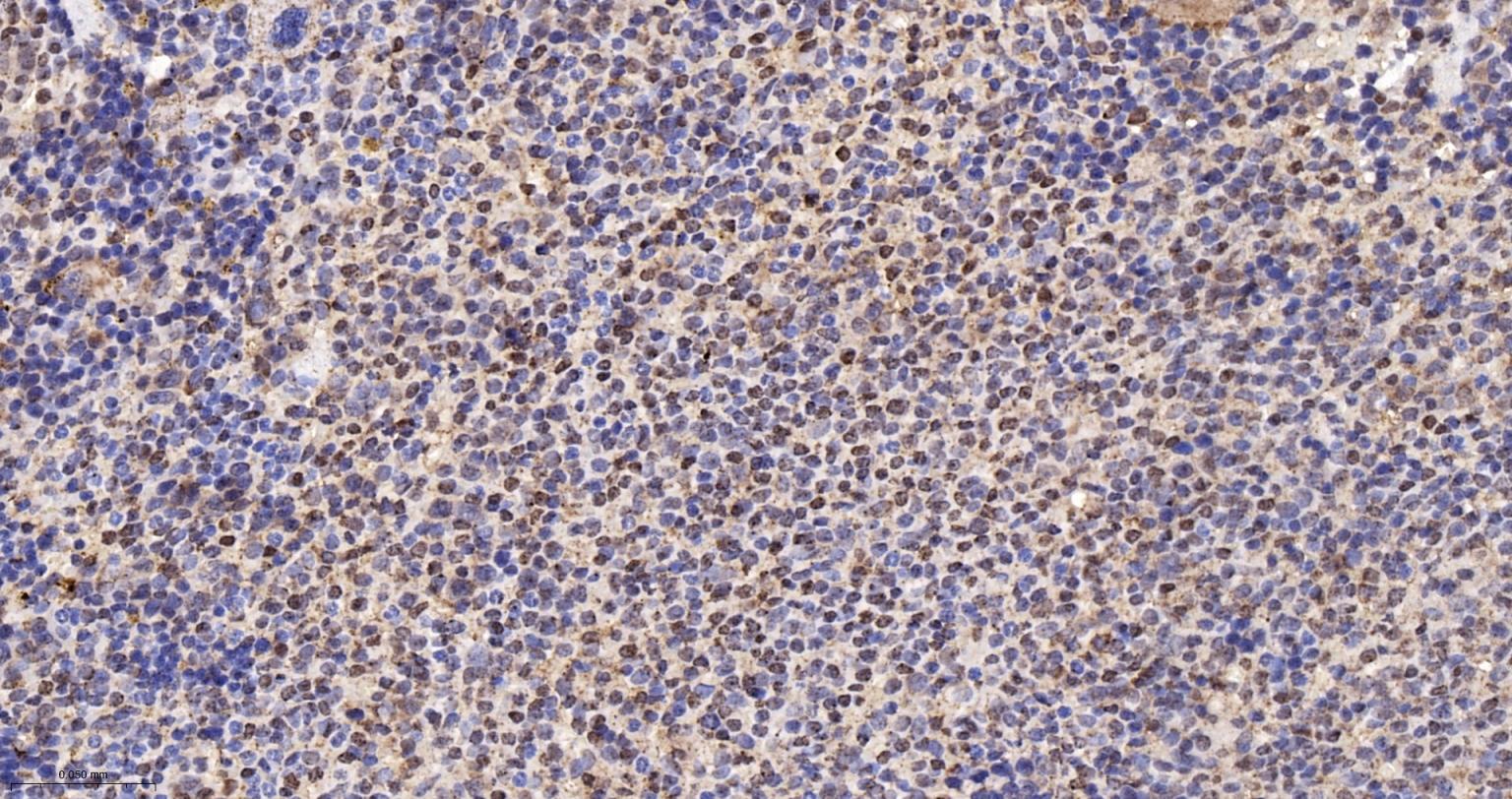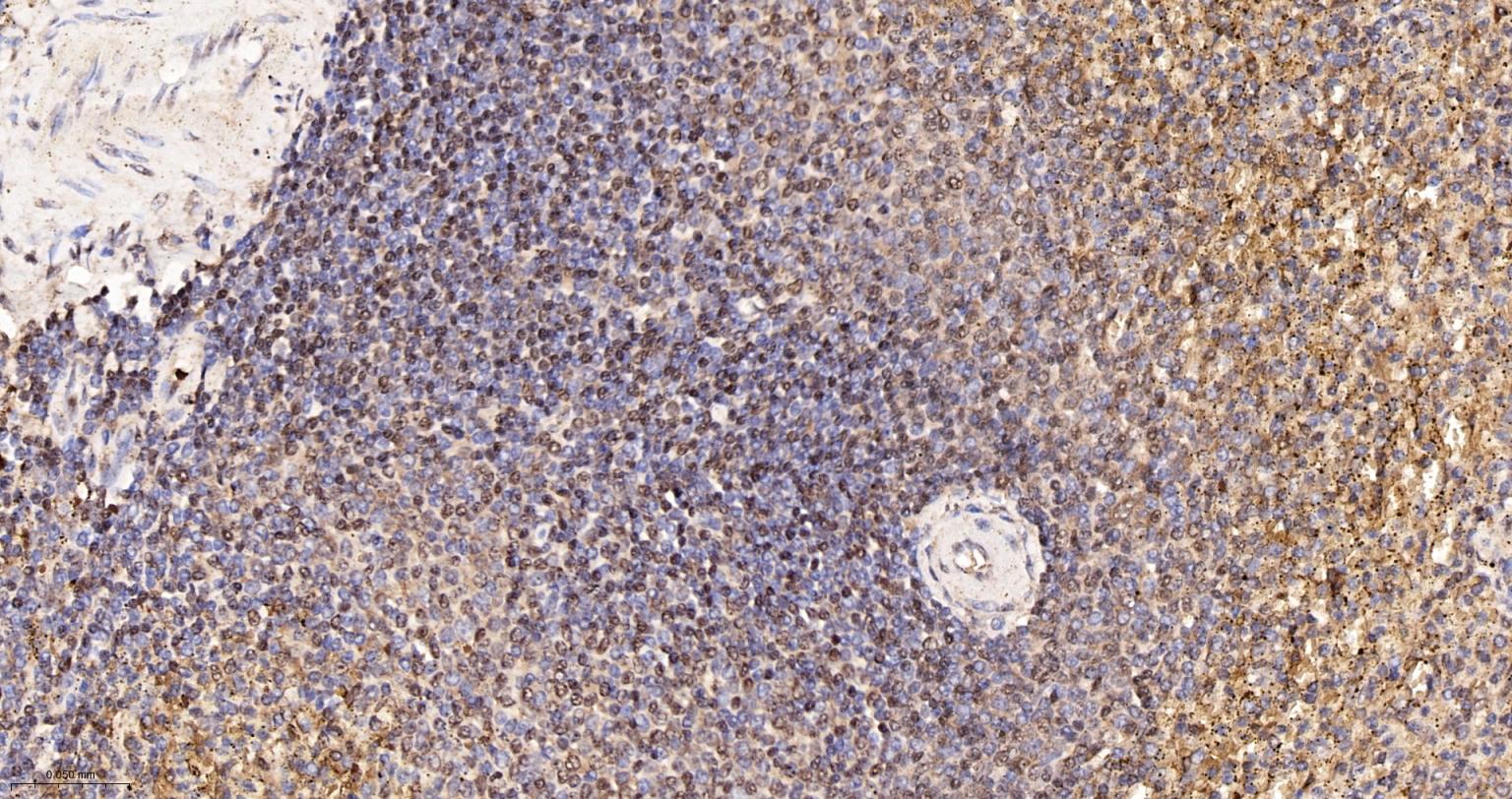 Paraformaldehyde-fixed, paraffin embedded Rat Spleen; Antigen retrieval by boiling in sodium citrate buffer (pH6.0) for 15 min; The section was incubated with APEX1 Monoclonal Antibody, Unconjugated (bsm-60707R) at 1:200 overnight at 4°C, followed by conjugation to the bs-0295G-HRP and DAB (C-0010) staining.
