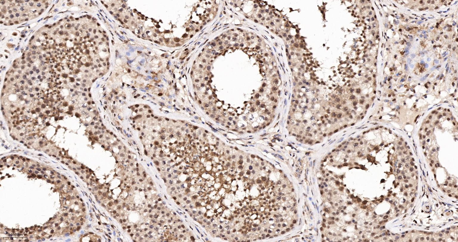 Paraformaldehyde-fixed, paraffin embedded Human Testicles; Antigen retrieval by boiling in sodium citrate buffer (pH6.0) for 15 min; The section was incubated with APEX1 Monoclonal Antibody, Unconjugated (bsm-60707R) at 1:200 overnight at 4°C, followed by conjugation to the bs-0295G-HRP and DAB (C-0010) staining.
