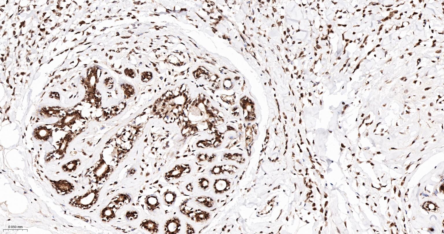 Paraformaldehyde-fixed, paraffin embedded Human Breast Cancer; Antigen retrieval by boiling in sodium citrate buffer (pH6.0) for 15 min; The section was incubated with APEX1 Monoclonal Antibody, Unconjugated (bsm-60707R) at 1:200 overnight at 4°C, followed by conjugation to the bs-0295G-HRP and DAB (C-0010) staining.