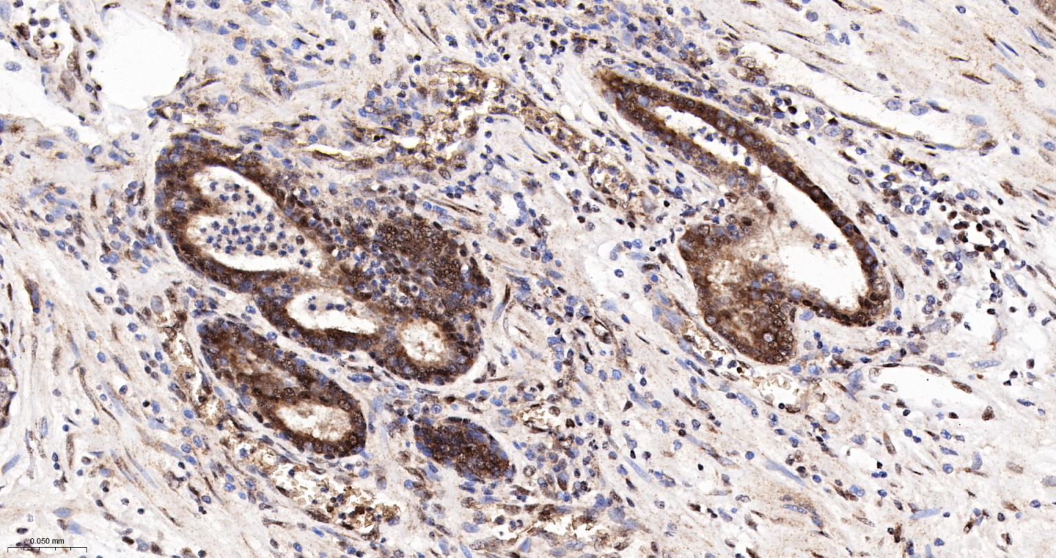 Paraformaldehyde-fixed, paraffin embedded Human Colon Cancer; Antigen retrieval by boiling in sodium citrate buffer (pH6.0) for 15 min; The section was incubated with APEX1 Monoclonal Antibody, Unconjugated (bsm-60707R) at 1:200 overnight at 4°C, followed by conjugation to the bs-0295G-HRP and DAB (C-0010) staining.