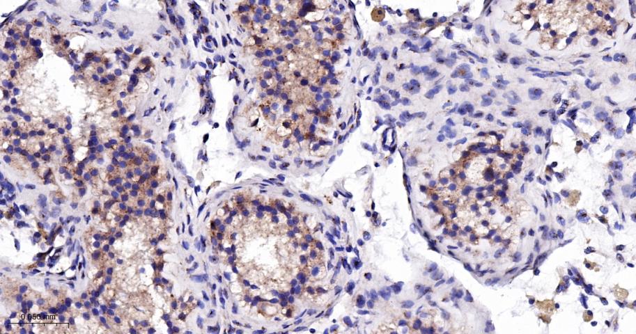 Paraformaldehyde-fixed, paraffin embedded Human Testicles; Antigen retrieval by boiling in sodium citrate buffer (pH6.0) for 15 min; The section was incubated with FGFR3 Monoclonal Antibody, Unconjugated (bsm-60715R) at 1:200 overnight at 4°C, followed by conjugation to the bs-0295G-HRP and DAB (C-0010) staining.