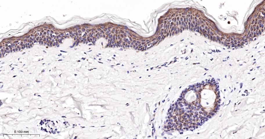 Paraformaldehyde-fixed, paraffin embedded Human Skin; Antigen retrieval by boiling in sodium citrate buffer (pH6.0) for 15 min; The section was incubated with FGFR3 Monoclonal Antibody, Unconjugated (bsm-60715R) at 1:200 overnight at 4°C, followed by conjugation to the bs-0295G-HRP and DAB (C-0010) staining.