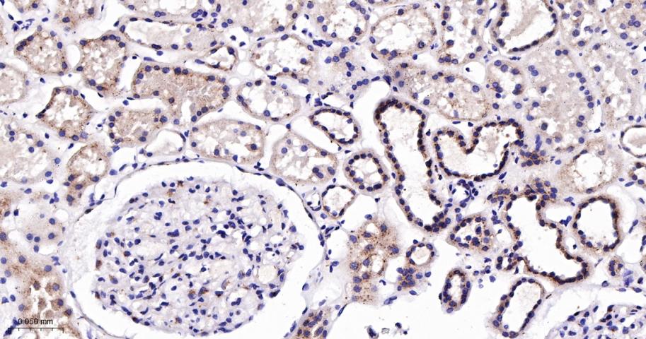 Paraformaldehyde-fixed, paraffin embedded Human Kidney; Antigen retrieval by boiling in sodium citrate buffer (pH6.0) for 15 min; The section was incubated with FGFR3 Monoclonal Antibody, Unconjugated (bsm-60715R) at 1:200 overnight at 4°C, followed by conjugation to the bs-0295G-HRP and DAB (C-0010) staining.