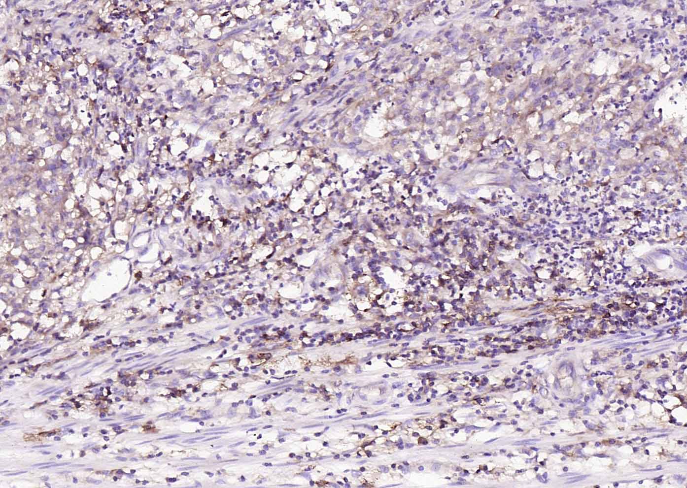 Paraformaldehyde-fixed, paraffin embedded (human lung carcinoma); Antigen retrieval by boiling in sodium citrate buffer (pH6.0) for 15min; Block endogenous peroxidase by 3% hydrogen peroxide for 20 minutes; Blocking buffer (normal goat serum) at 37°C for 30min; Antibody incubation with (HLA-C) Monoclonal Antibody, Unconjugated (bsm-43093M) at 1:200 overnight at 4°C, followed by operating according to SP Kit(Mouse)(sp-0024) instructionsand DAB staining.