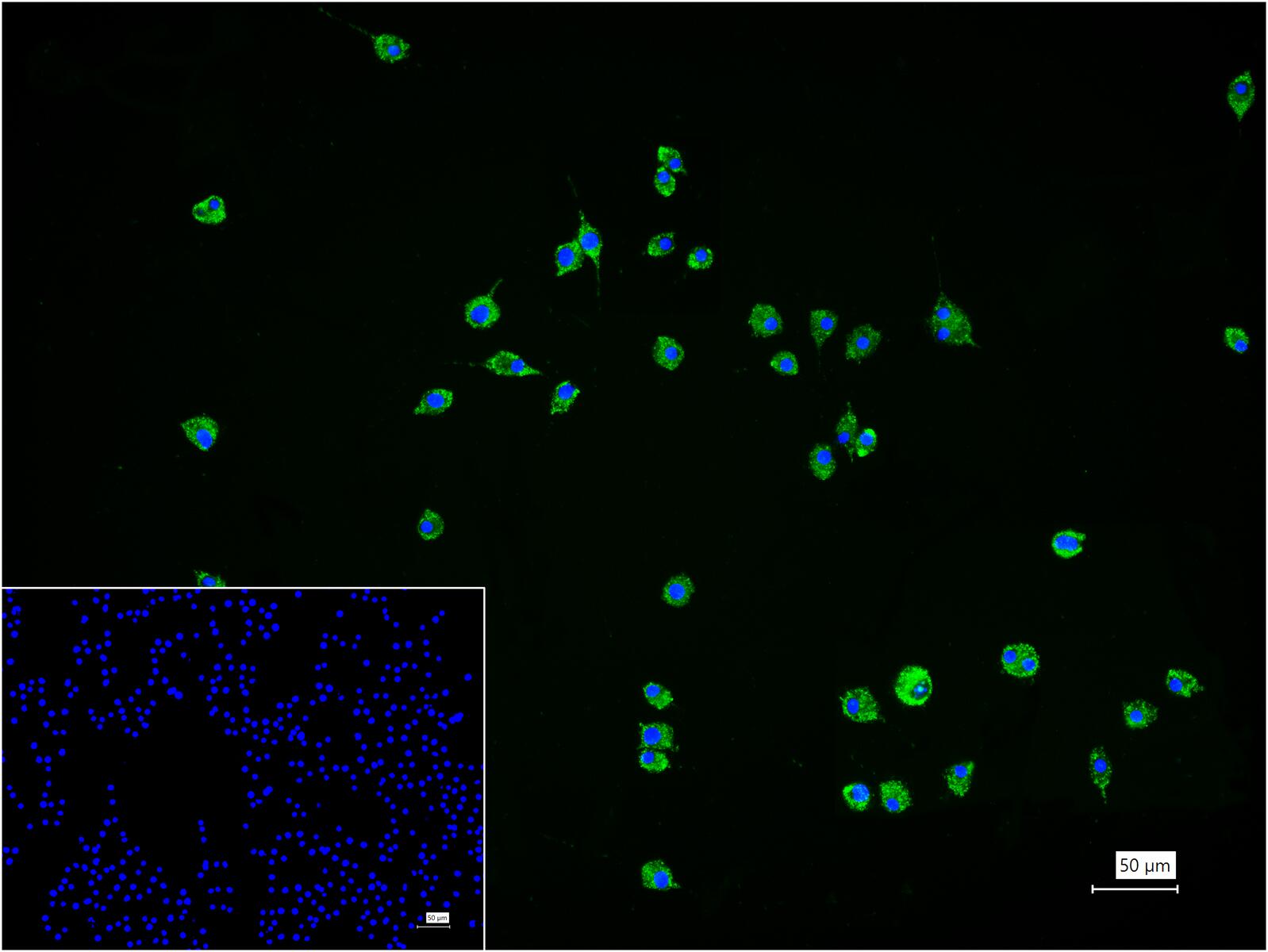 4% Paraformaldehyde-fixed L-929 (treated with 20 ng/ml TNF alpha, 100 nM Smac mimetic, and 20 µM z-VAD for 8 h) (M) cell; Triton X-100 at r.t. for 20 min; Antibody incubation with (phospho-MLKL (Ser345)) polyclonal Antibody, unconjugated (bs-25447R) 1:100, 90 min at 37°C; followed by BF488 conjugated Goat Anti-Rabbit IgG antibody (green, bs-60295G-BF488) at 37°C for 90 min, DAPI (blue, C02-04002) was used to stain the cell nuclei. PBS instead of the primary antibody was used as the blank control.