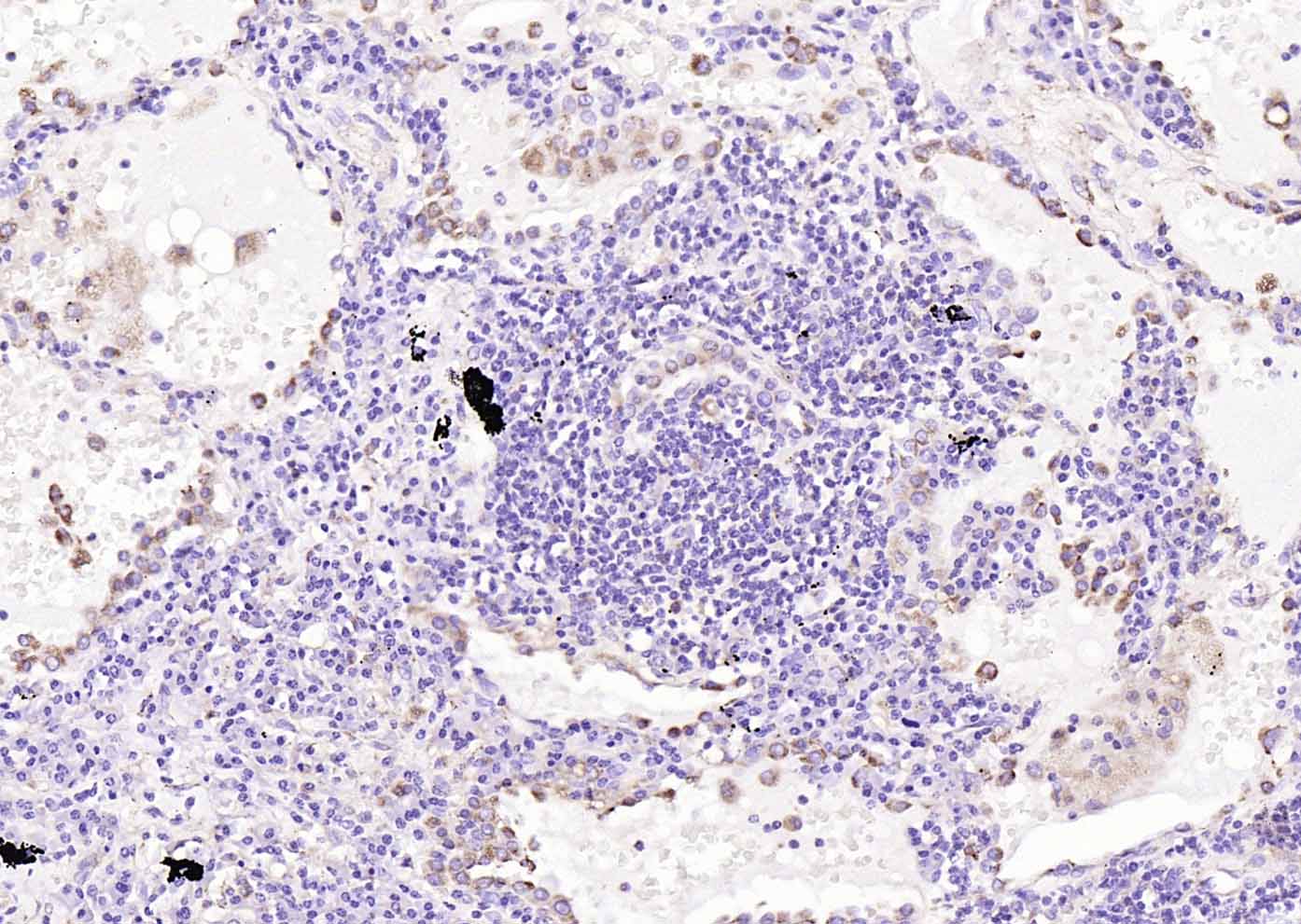 Paraformaldehyde-fixed, paraffin embedded (human lung); Antigen retrieval by boiling in sodium citrate buffer (pH6.0) for 15min; Block endogenous peroxidase by 3% hydrogen peroxide for 20 minutes; Blocking buffer (normal goat serum) at 37°C for 30min; Incubation with (LAMP1) Polyclonal Antibody, Unconjugated (bs-41335R) at 1:200 overnight at 4°C, followed by operating according to SP Kit(Rabbit) (sp-0023) instructionsand DAB staining.