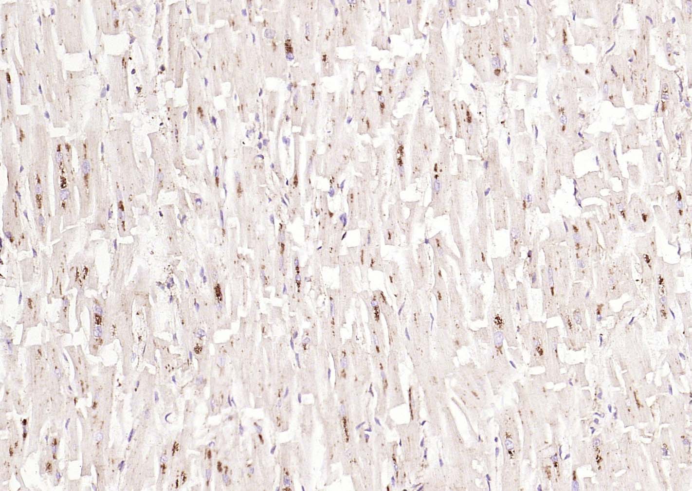 Paraformaldehyde-fixed, paraffin embedded (human heart); Antigen retrieval by boiling in sodium citrate buffer (pH6.0) for 15min; Block endogenous peroxidase by 3% hydrogen peroxide for 20 minutes; Blocking buffer (normal goat serum) at 37°C for 30min; Incubation with (LAMP1) Polyclonal Antibody, Unconjugated (bs-41335R) at 1:100 overnight at 4°C, followed by operating according to SP Kit(Rabbit) (sp-0023) instructionsand DAB staining.