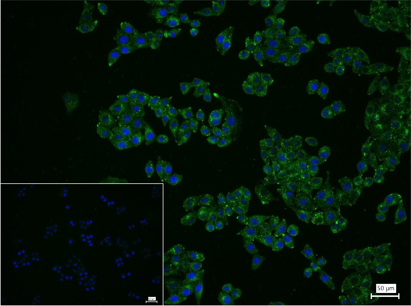 4% Paraformaldehyde-fixed MCF-7 (H) cell; Triton X-100 at r.t. for 20 min; Antibody incubation with (LAMP1) polyclonal Antibody, unconjugated (bs-41335R) 1:200, 90 min at 37°C; followed by conjugated Goat Anti-Rabbit IgG antibody (green, bs-0295G-FITC) at 37°C for 90 min, DAPI (blue, C02-04002) was used to stain the cell nuclei. PBS instead of the primary antibody was used as the blank control.