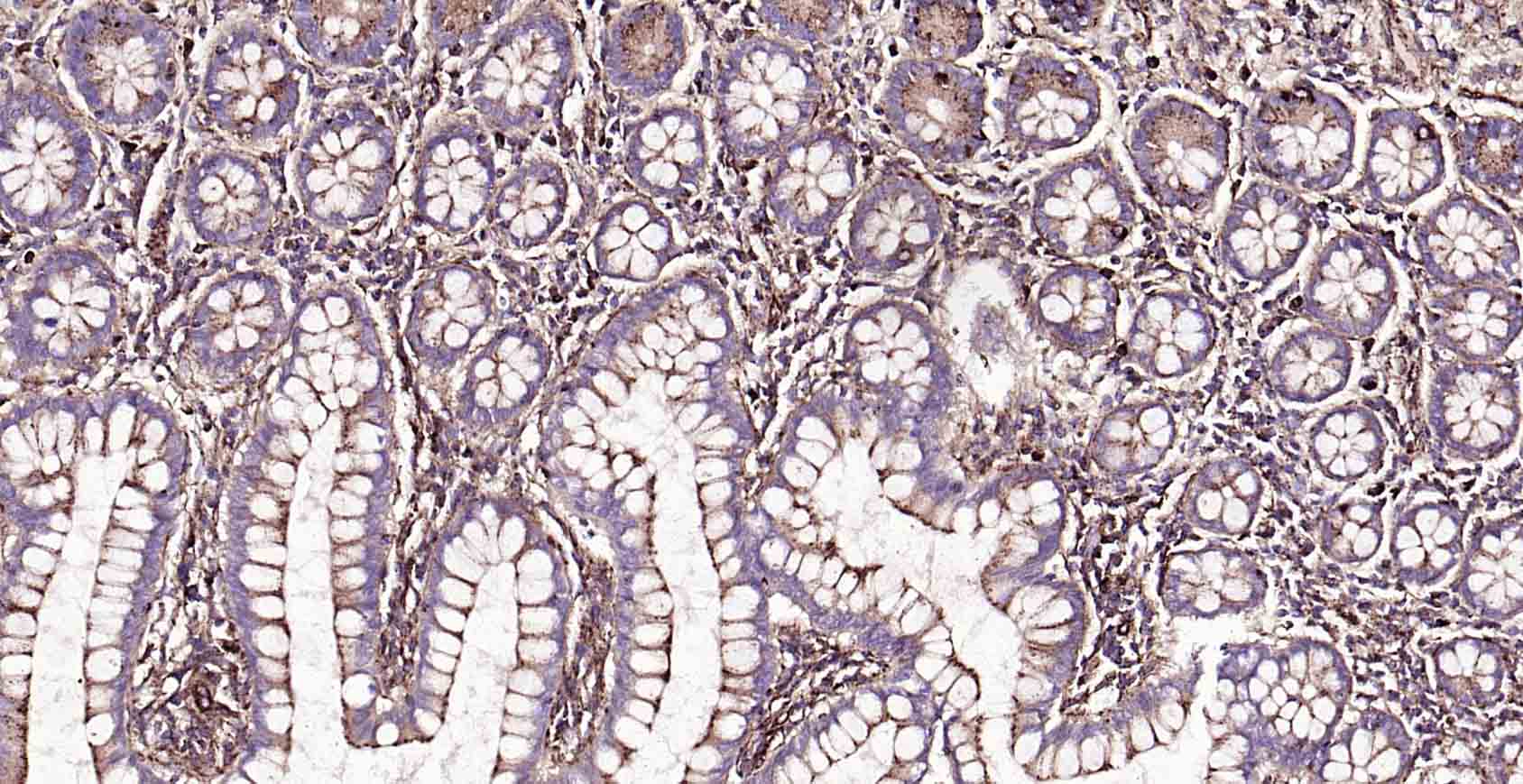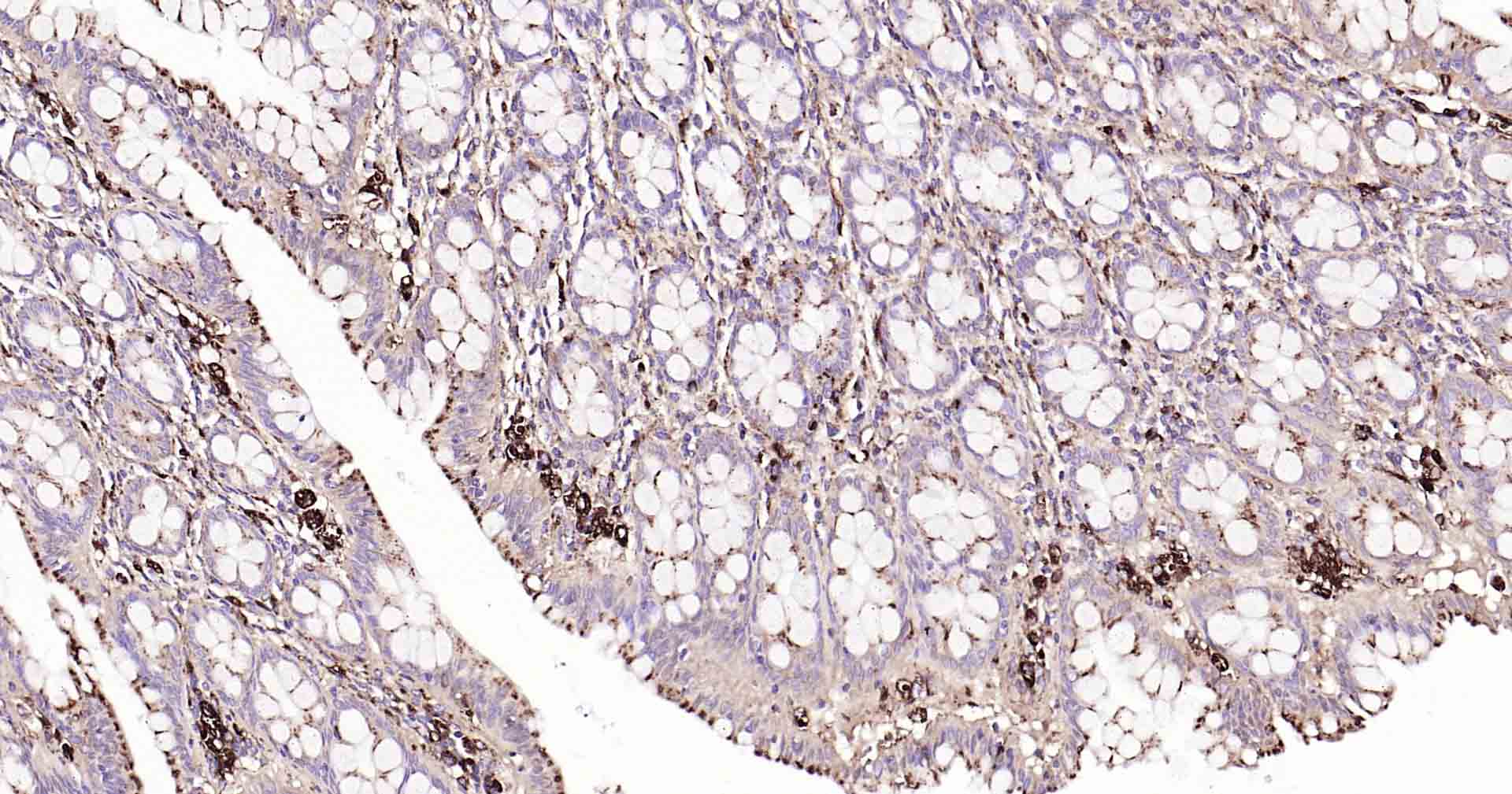 Paraformaldehyde-fixed, paraffin embedded Human Colon; Antigen retrieval by boiling in sodium citrate buffer (pH6.0) for 15 min; Antibody incubation with LAMP1 Polyclonal Antibody, Unconjugated (bs-41335R) at 1:200 overnight at 4°C, followed by conjugation to the SP Kit (Rabbit, SP-0023) and DAB (C-0010) staining.