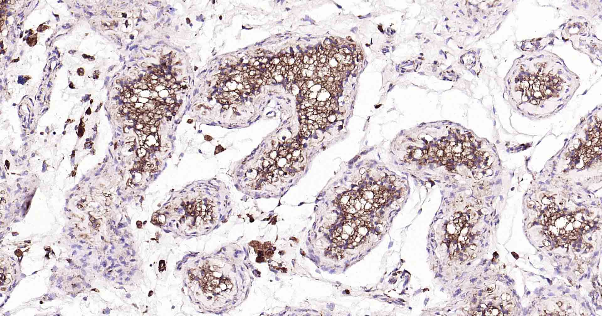 Paraformaldehyde-fixed, paraffin embedded Human Testicles; Antigen retrieval by boiling in sodium citrate buffer (pH6.0) for 15 min; Antibody incubation with LAMP1 Polyclonal Antibody, Unconjugated (bs-41335R) at 1:200 overnight at 4°C, followed by conjugation to the SP Kit (Rabbit, SP-0023) and DAB (C-0010) staining.