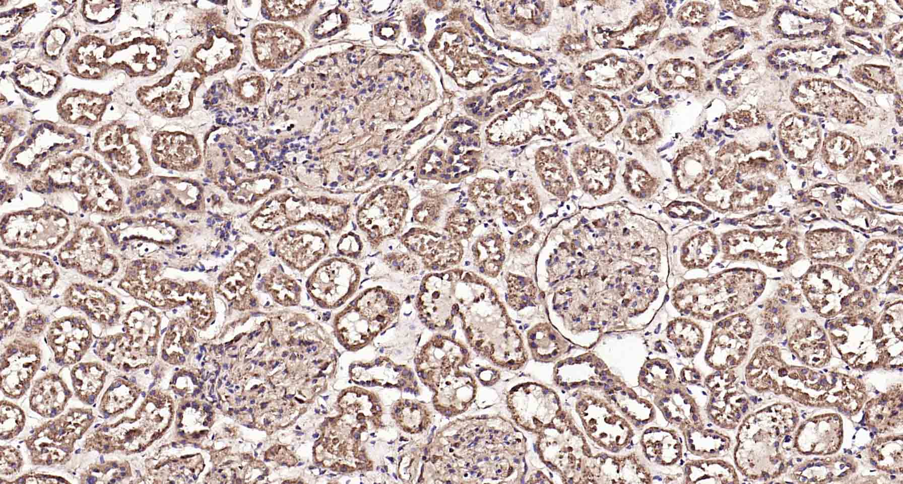 Paraformaldehyde-fixed, paraffin embedded Human Kidney; Antigen retrieval by boiling in sodium citrate buffer (pH6.0) for 15 min; Antibody incubation with LAMP1 Polyclonal Antibody, Unconjugated (bs-41335R) at 1:200 overnight at 4°C, followed by conjugation to the SP Kit (Rabbit, SP-0023) and DAB (C-0010) staining.