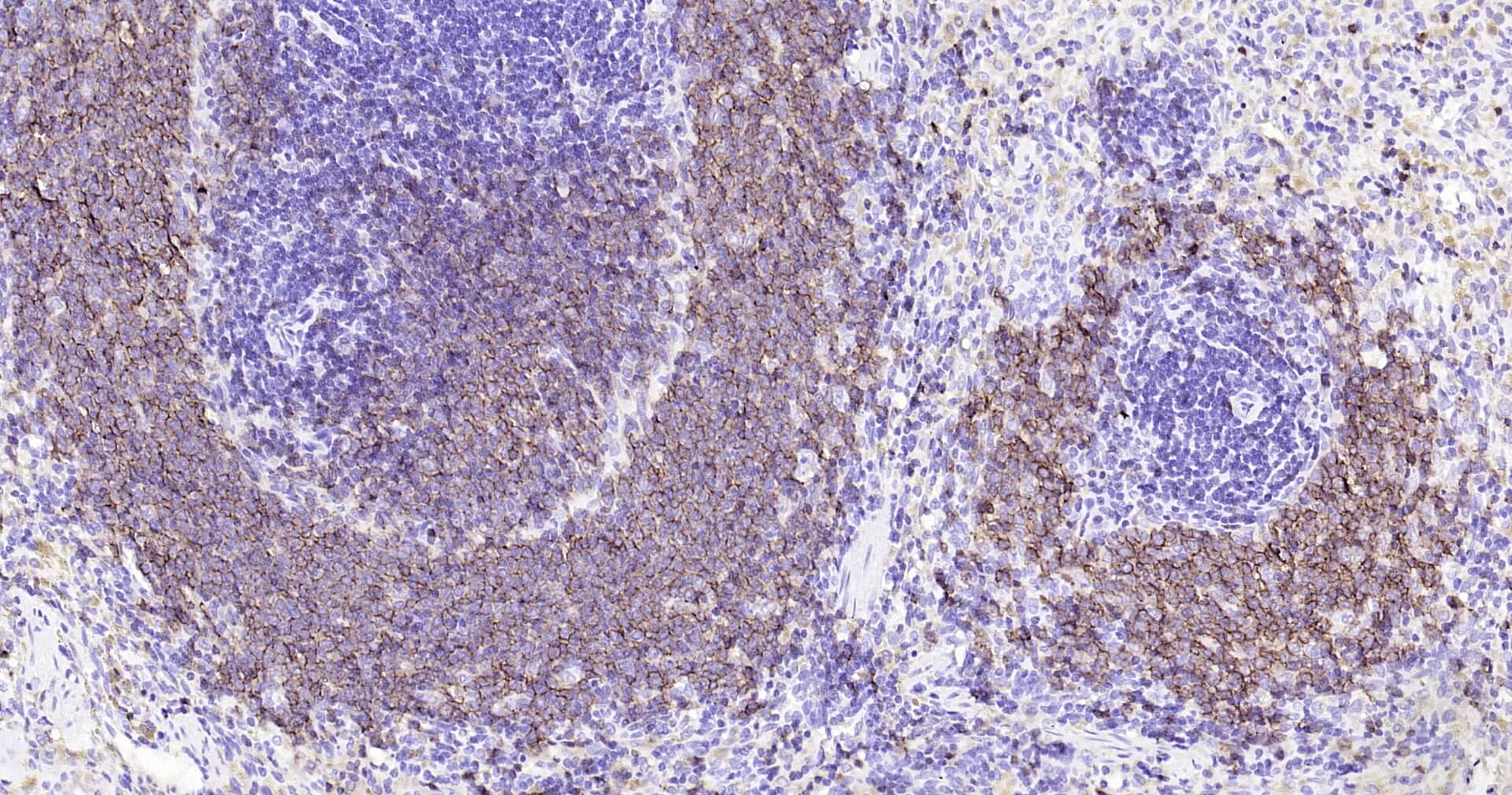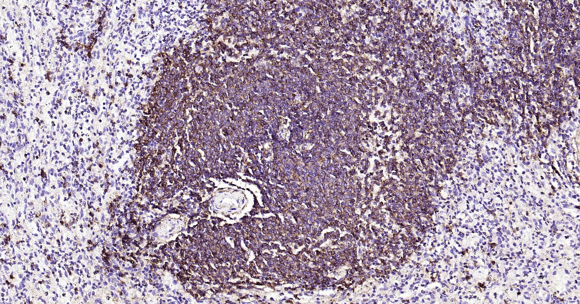 Immunohistochemical analysis of paraffin embedded human spleen tissue slide using IHC0125 (CD20 IHC Kit).