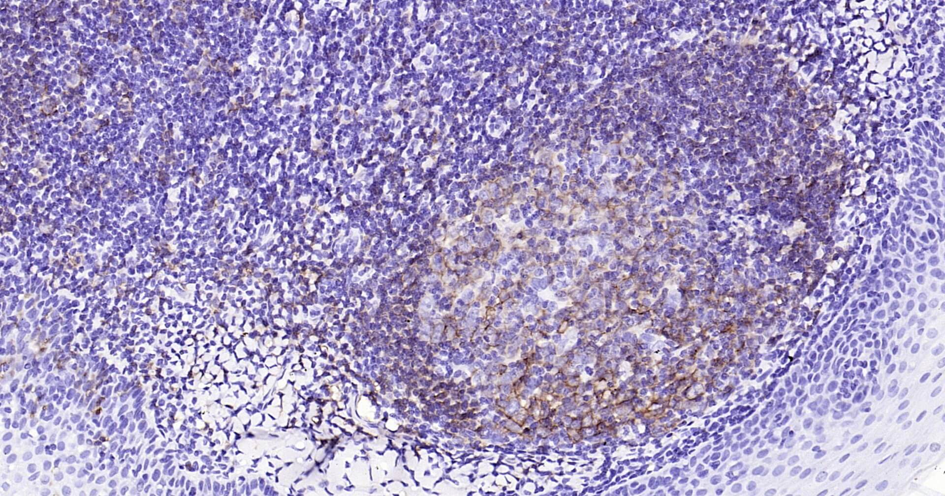 Immunohistochemical analysis of paraffin embedded human tonsil tissue slide using IHC0125 (CD20 IHC Kit).