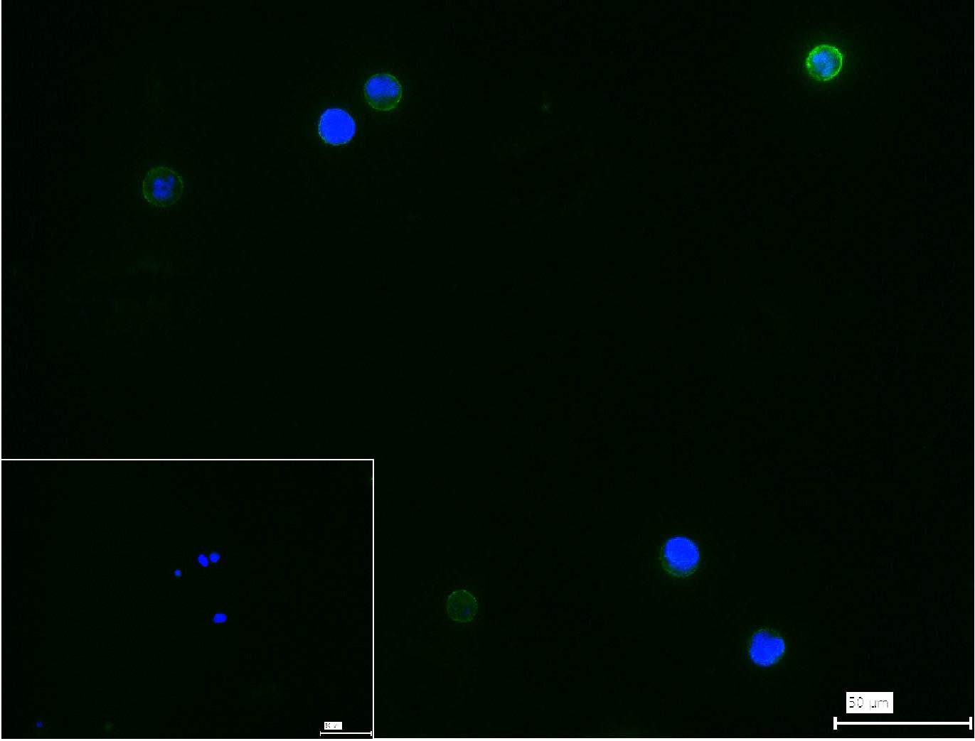4% Paraformaldehyde-fixed Daudi (H) cell; Antibody incubation with (CD86) monoclonal Antibody, unconjugated (bsm-43589R) 1:100, 90 min at 37°C; followed by conjugated Goat Anti-Rabbit IgG antibody (green, bs-40295G-FITC) at 37°C for 90 min, DAPI (blue, C02-04002) was used to stain the cell nuclei. PBS instead of the primary antibody was used as the blank control.