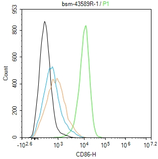 The Daudi(H) cells were incubated in 5%BSA to block non-specific protein-protein interactions (30 min at r.t.). Primary Antibody (green): Rabbit Anti-CD86 antibody (bsm-43589R): 1 μg/10^6 cells; Secondary Antibody (white blue): Goat anti-Rabbit IgG-FITC (bs-60295G-FITC): 1 μg/test. Isotype Control (orange): Rabbit IgG (bs-0295P). Blank control (black): PBS. Acquisition of 20,000 events was performed.