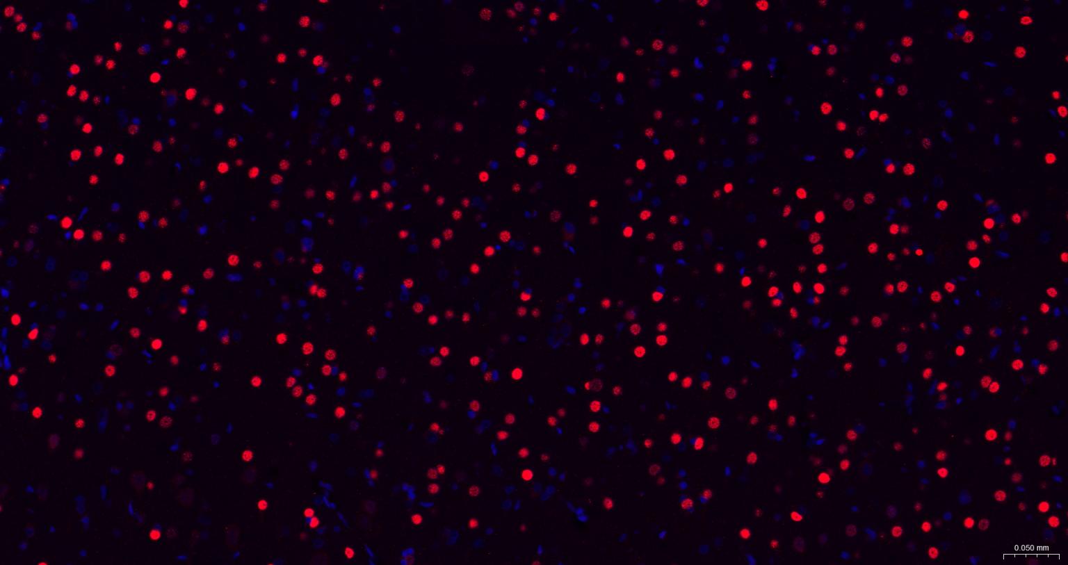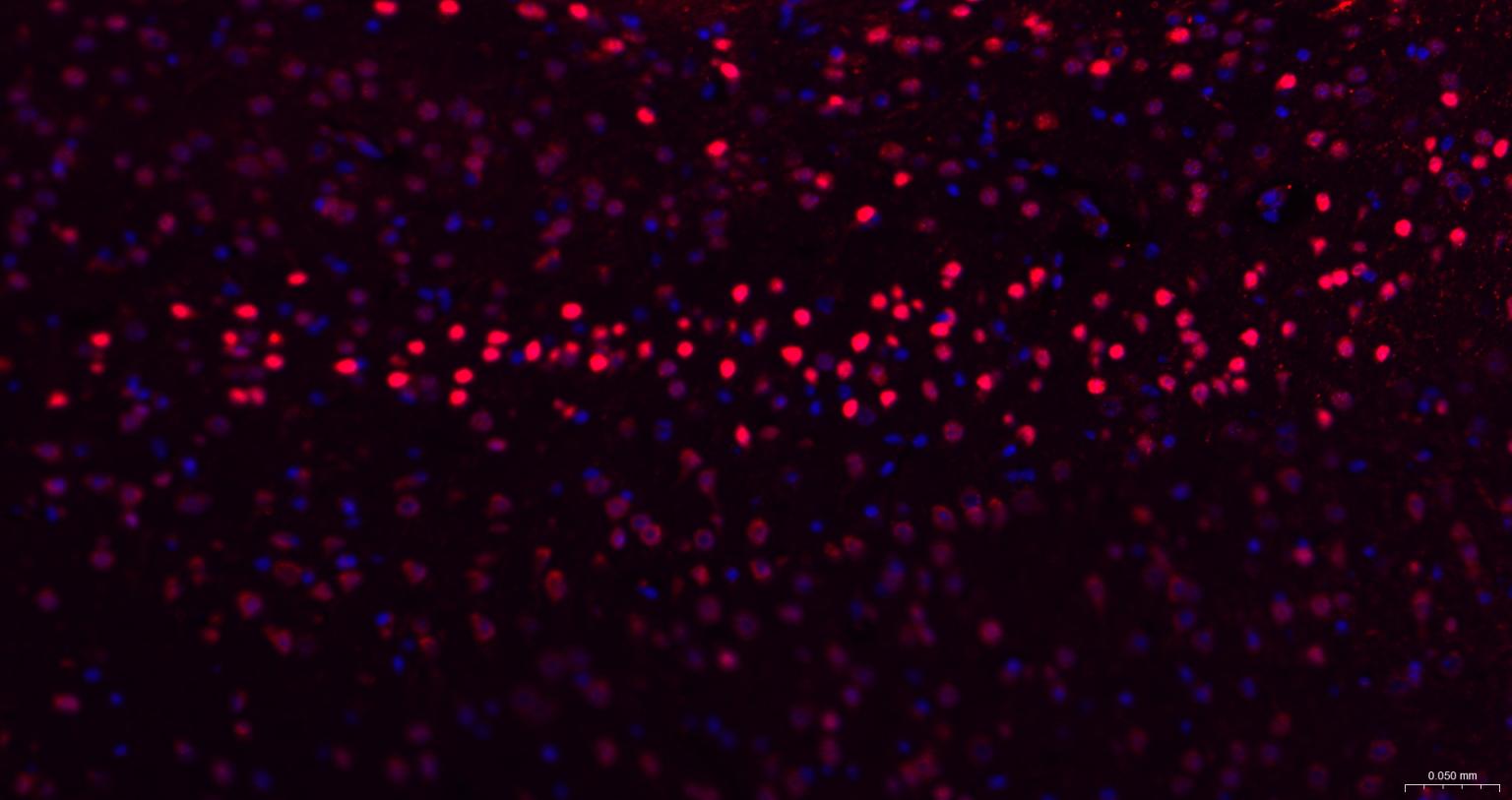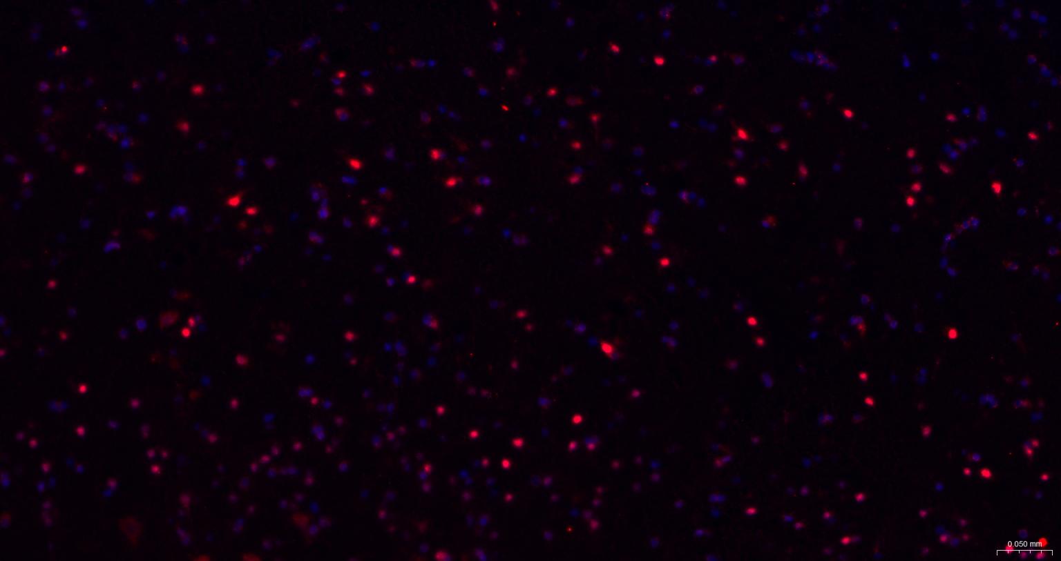 Paraformaldehyde-fixed, paraffin embedded Rat Cerebrum; Antigen retrieval by boiling in sodium citrate buffer (pH6.0) for 15 min; The section was incubated with TBR1 Monoclonal Antibody, Unconjugated (bsm-60877R) at 1:200 overnight at 4°C. Followed by conjugated Goat Anti-Rabbit IgG antibody (Red, bs-0295G-BF594), DAPI (blue, C02-04002) was used to stain the cell nuclei.