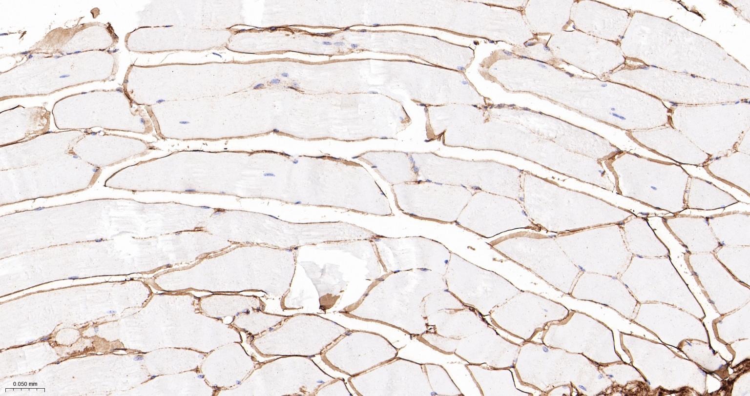 Paraformaldehyde-fixed, paraffin embedded Mouse Skeletal muscle; Antigen retrieval by boiling in sodium citrate buffer (pH6.0) for 15 min; The section was incubated with Collagen VI Monoclonal Antibody, Unconjugated (bsm-61026R) at 1:200 overnight at 4°C, followed by conjugation to the bs-0295G-HRP and DAB (C-0010) staining.