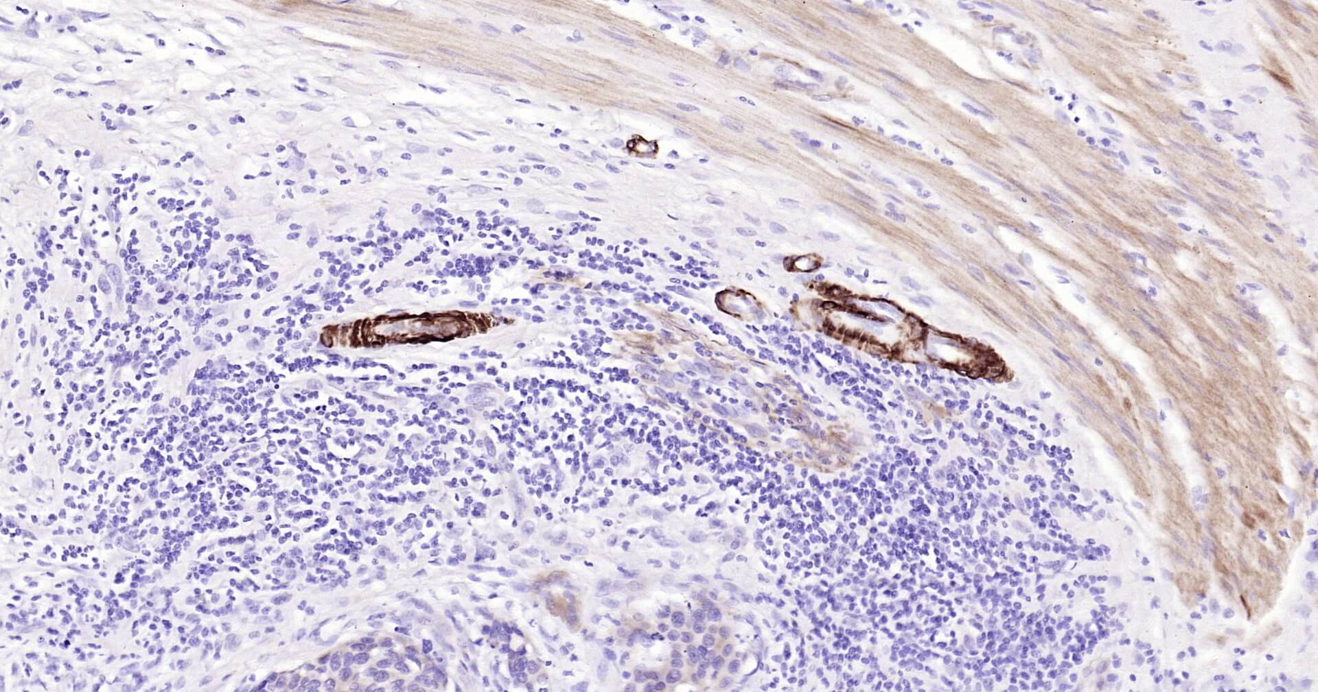 Immunohistochemical analysis of paraffin embedded human breast carcinoma tissue slide using IHC0151H (Human SMMHC IHC Kit).