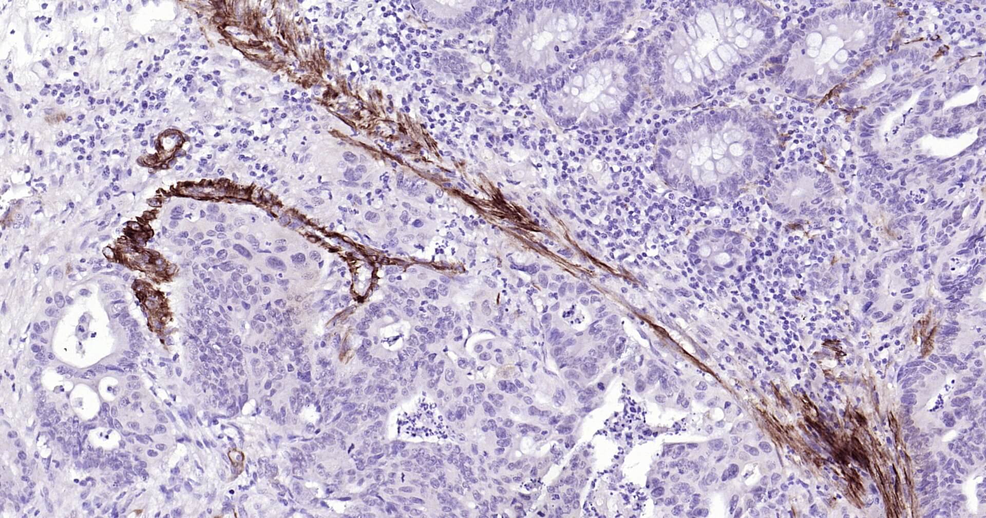 Immunohistochemical analysis of paraffin embedded human colon carcinoma tissue slide using IHC0151H (Human SMMHC IHC Kit).