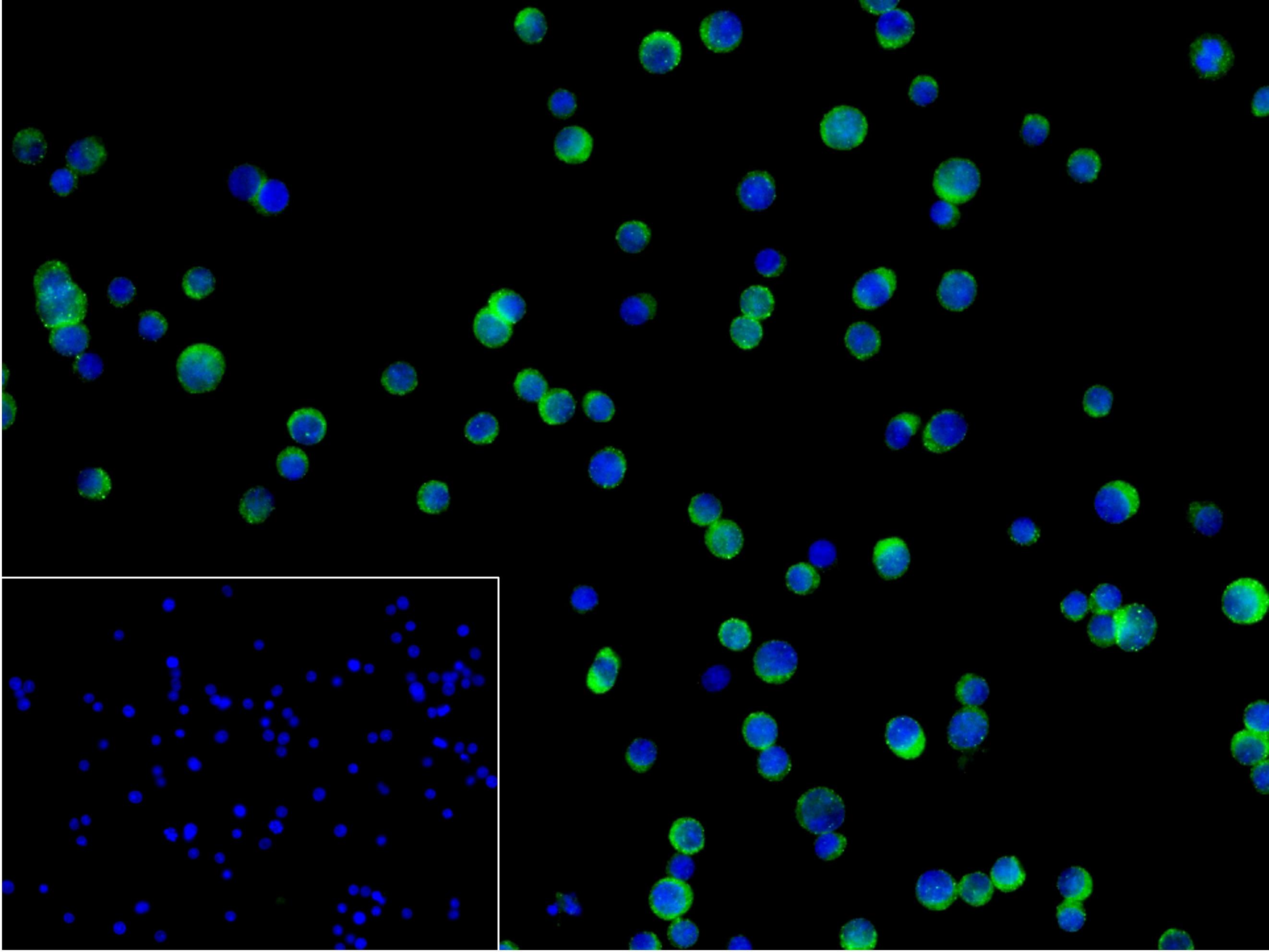 4% Paraformaldehyde-fixed Jurkat (H) cell; Triton X-100 at r.t. for 20 min; Antibody incubation with (PYK2) monoclonal Antibody, unconjugated (bsm-52553R) 1:100, 90 min at 37°C; followed by conjugated Goat Anti-Rabbit IgG antibody (green, bs-60295G-BF488) at 37°C for 90 min, DAPI (blue, C02-04002) was used to stain the cell nuclei. PBS instead of the primary antibody was used as the blank control.
