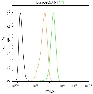 The Jurkat (H) cells were fixed with 4% PFA (10 min at r.t.) and then permeabilized with 90% ice-cold methanol for 20 min at -20℃,the cells then were incubated in 5%BSA to block non-specific protein-protein interactions (30 min at r.t.), followed by secondary antibody incubation for 40 min at room temperature. Primary Antibody (green):Rabbit Anti-PYK2 antibody (bsm-52553R,1:100); Isotype Control (orange): Rabbit IgG (bs-0295P). Blank control (black): PBS. Acquisition of 20,000 events was performed.