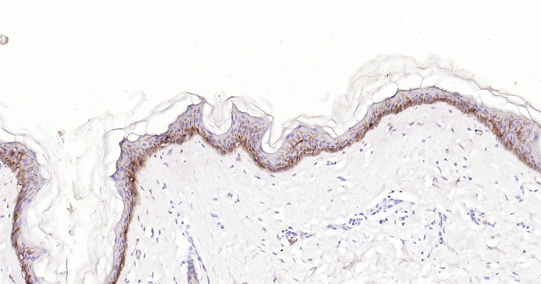 Immunohistochemical analysis of paraffin embedded human skin tissue slide using IHC0232H (Human CD1A IHC Kit).