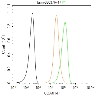 The Hela (H) cells were fixed with 4% PFA (10 min at r.t.) and then permeabilized with 90% ice-cold methanol for 20 min at -20℃,the cells then were incubated in 5%BSA to block non-specific protein-protein interactions (30 min at r.t.), followed by secondary antibody incubation for 40 min at room temperature. Primary Antibody (green):Rabbit Anti-COX4I1 antibody (bsm-33037R): 1 μg/10^6 cells; Isotype Control (orange): Rabbit IgG (bs-0295P). Blank control (black): PBS. Acquisition of 20,000 events was performed.