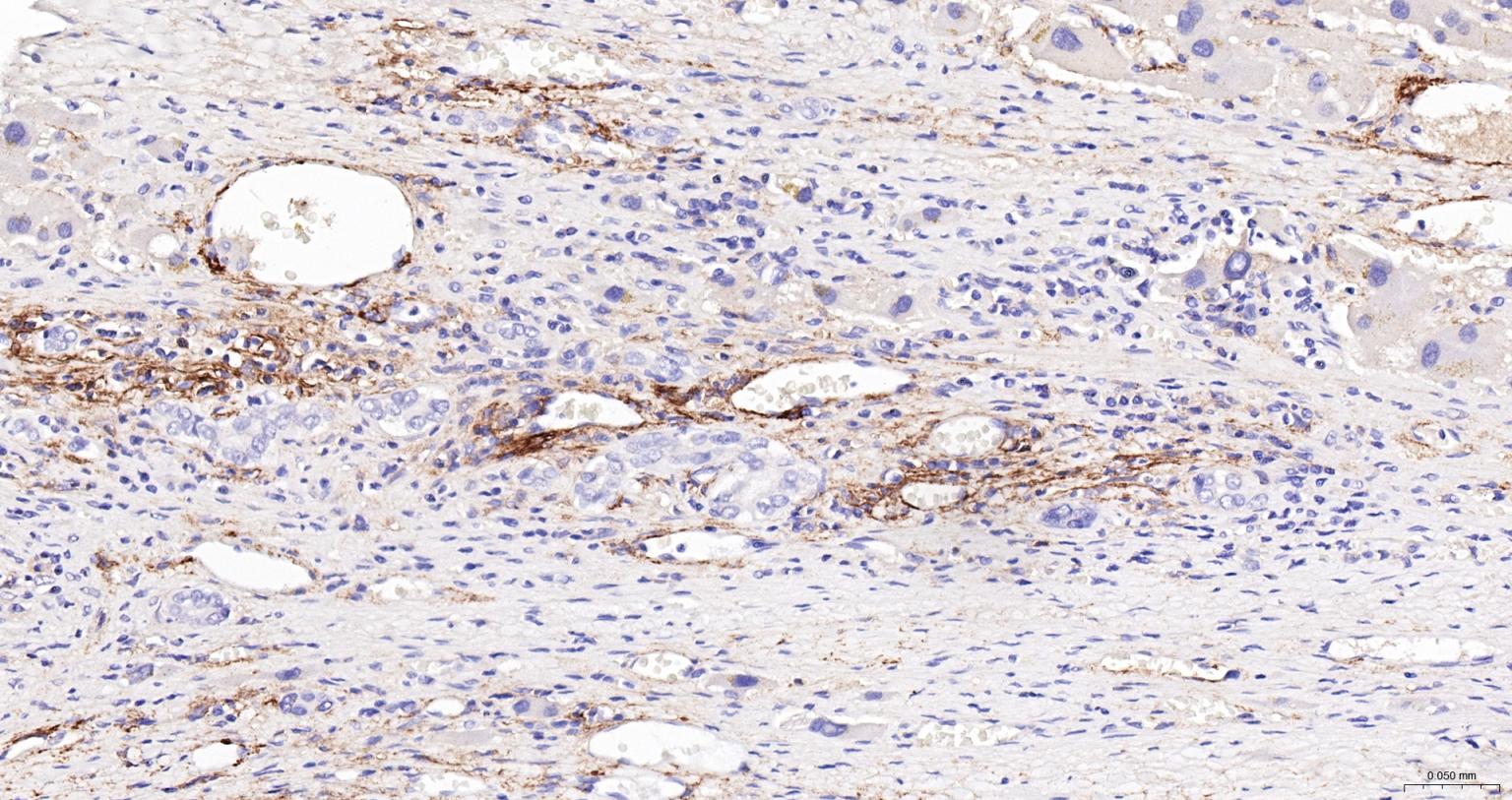 Paraformaldehyde-fixed, paraffin embedded Human Liver Cancer; Antigen retrieval by boiling in sodium citrate buffer (pH6.0) for 15 min; The section was incubated with NGFR Monoclonal Antibody, Unconjugated (bsm-43637R) at 1:200 overnight at 4°C, followed by conjugation to the bs-0295G-HRP and DAB (C-0010) staining.