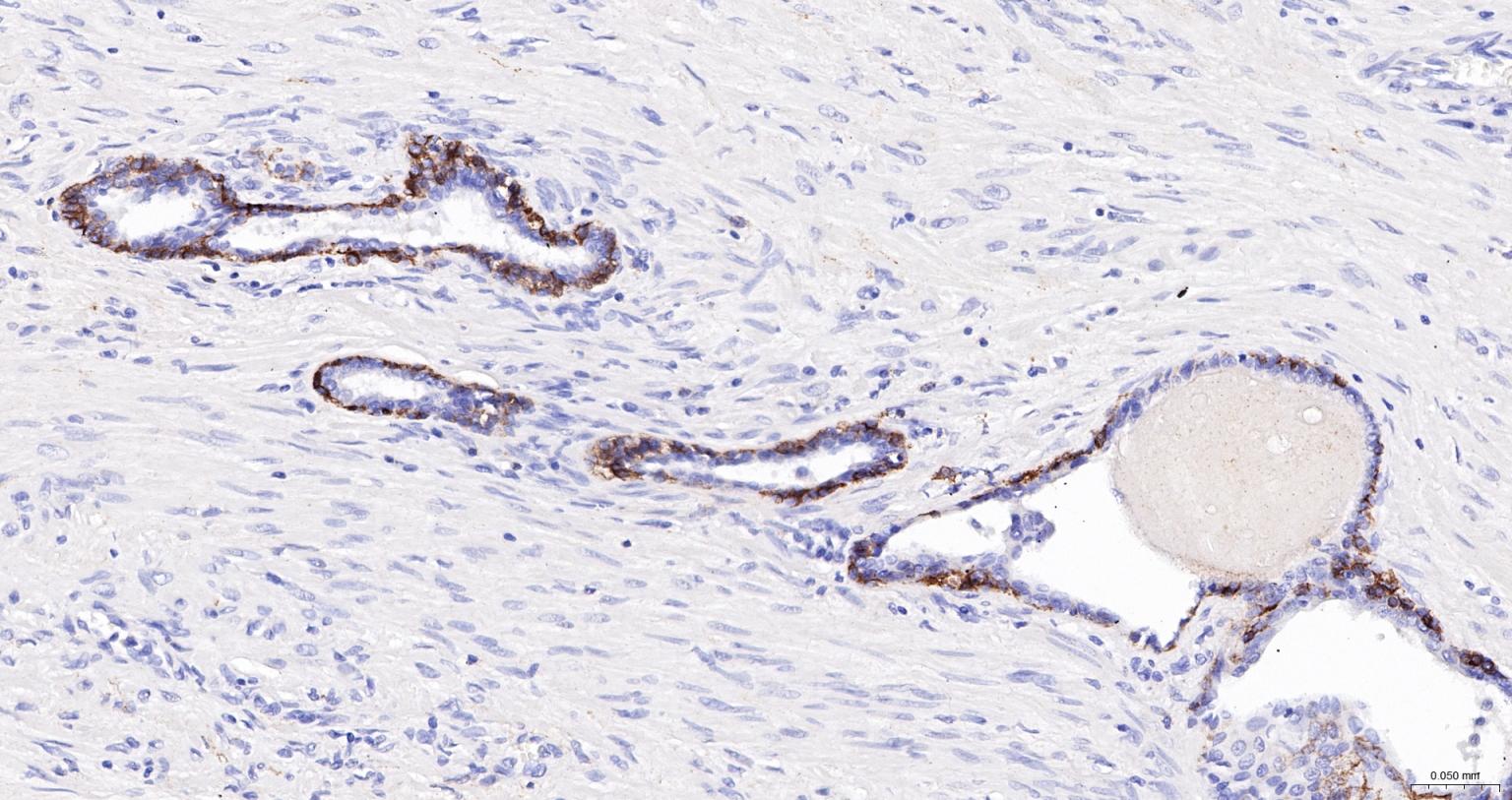 Paraformaldehyde-fixed, paraffin embedded Human Prostate; Antigen retrieval by boiling in sodium citrate buffer (pH6.0) for 15 min; The section was incubated with NGFR Monoclonal Antibody, Unconjugated (bsm-43637R) at 1:200 overnight at 4°C, followed by conjugation to the bs-0295G-HRP and DAB (C-0010) staining.