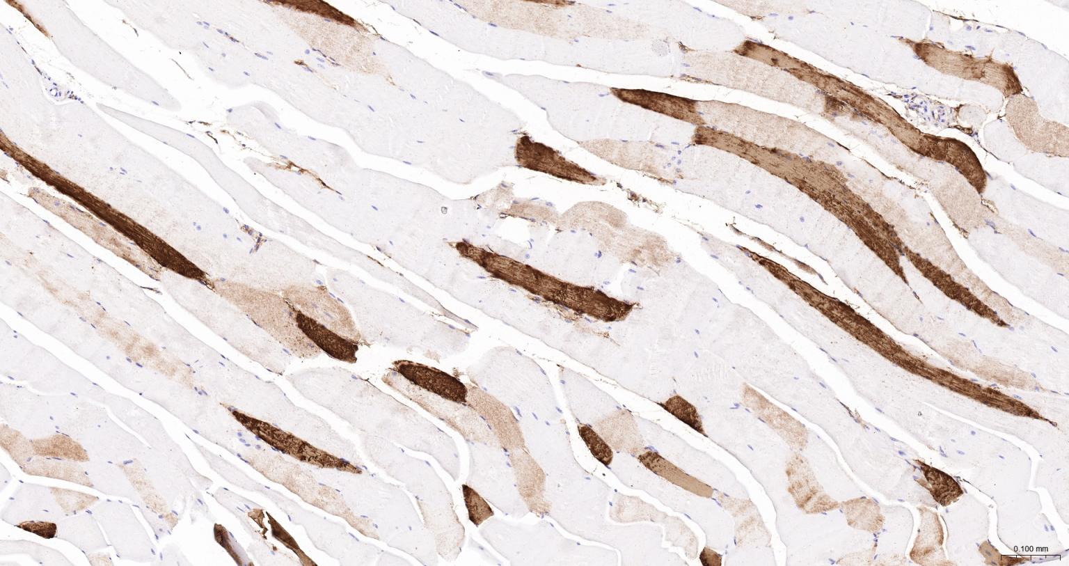 Paraformaldehyde-fixed, paraffin embedded Human Skeletal muscle; Antigen retrieval by boiling in sodium citrate buffer (pH6.0) for 15 min; The section was incubated with Myoglobin Monoclonal Antibody, Unconjugated (bsm-41107R) at 1:200 overnight at 4°C, followed by conjugation to the bs-0295G-HRP and DAB (C-0010) staining.