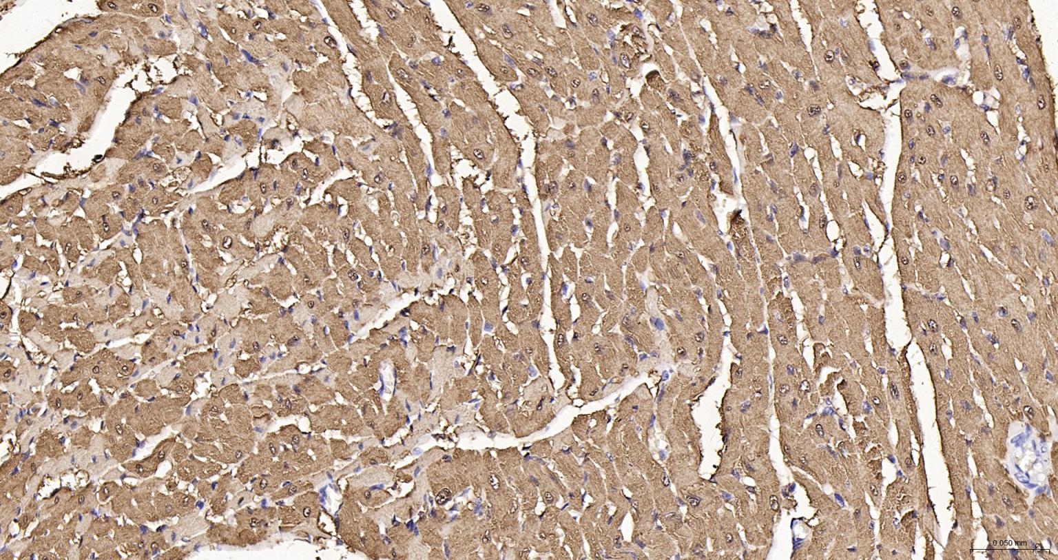 Paraformaldehyde-fixed, paraffin embedded Rat Heart; Antigen retrieval by boiling in sodium citrate buffer (pH6.0) for 15 min; The section was incubated with Myoglobin Monoclonal Antibody, Unconjugated (bsm-41107R) at 1:200 overnight at 4°C, followed by conjugation to the bs-0295G-HRP and DAB (C-0010) staining.