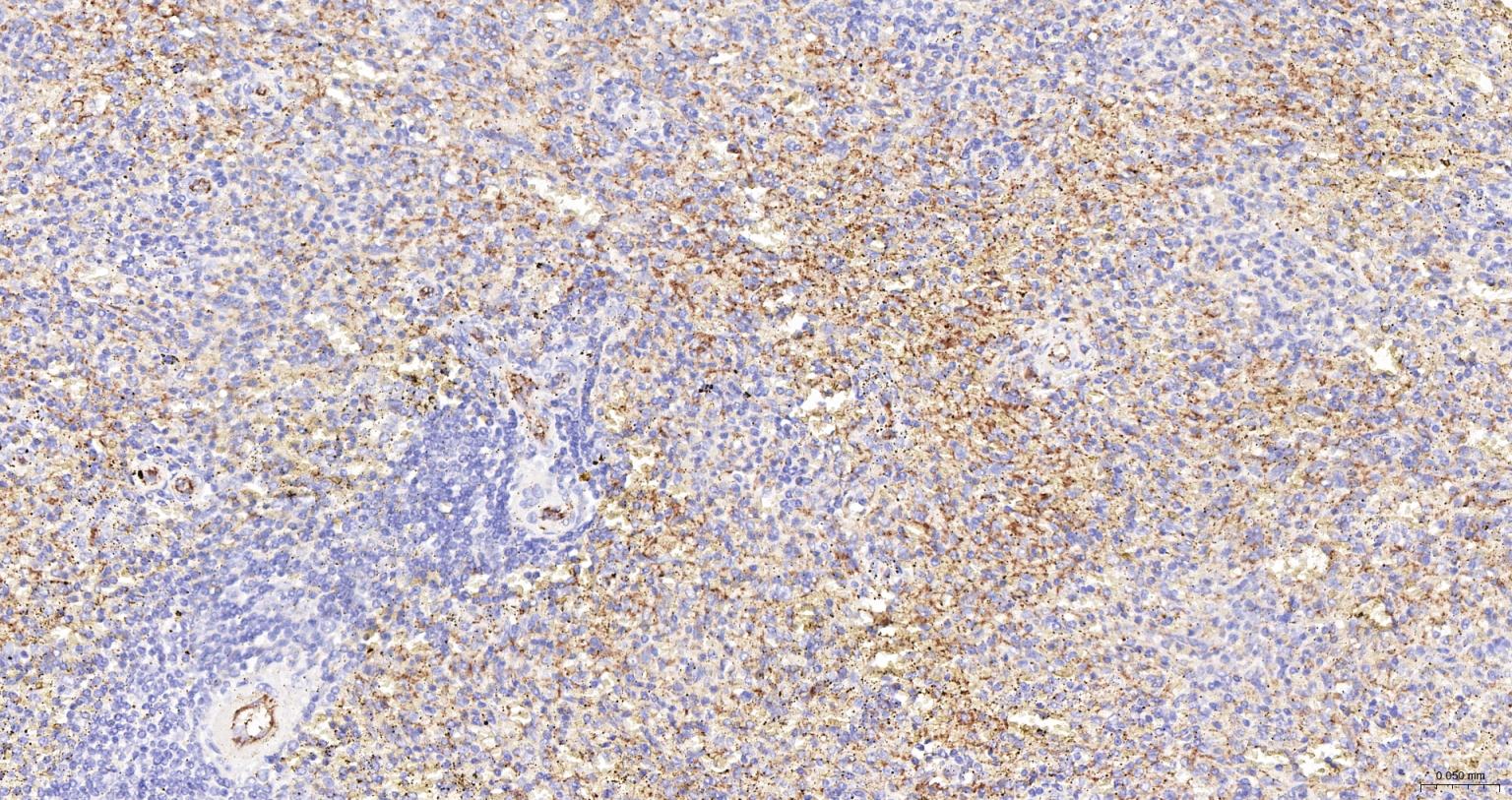 Paraformaldehyde-fixed, paraffin embedded Human Spleen; Antigen retrieval by boiling in sodium citrate buffer (pH6.0) for 15 min; The section was incubated with CD31 Monoclonal Antibody (bsm-10825R-HRP) at 1:200 overnight at 4°C, and DAB (C-0010) staining.