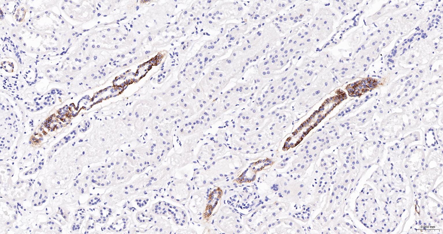 Paraformaldehyde-fixed, paraffin embedded Human Kidney; Antigen retrieval by boiling in sodium citrate buffer (pH6.0) for 15 min; The section was incubated with CD171/L1CAM Monoclonal Antibody (bsm-52926R-HRP) at 1:200 overnight at 4°C, and DAB (C-0010) staining.
