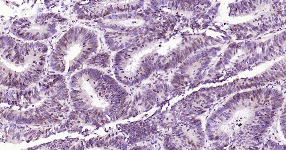 Immunohistochemical analysis of paraffin embedded human colon cancer tissue slide using IHC0387 (phospho-STAT3 (Ser727) Kit).