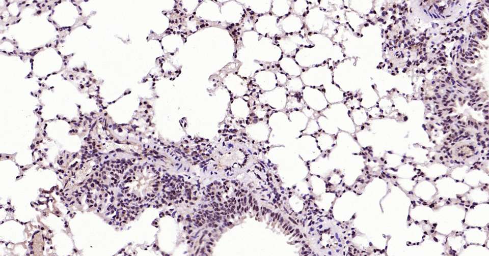 Immunohistochemical analysis of paraffin embedded mouse lung tissue slide using IHC0387 (phospho-STAT3 (Ser727) Kit).