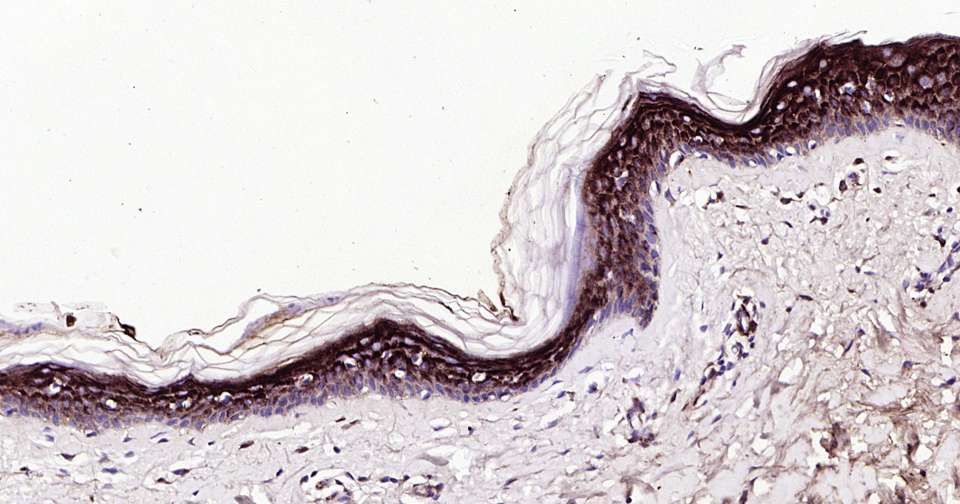 Immunohistochemical analysis of paraffin embedded human skin tissue slide using IHC0392H (Human Apolipoprotein E Kit).
