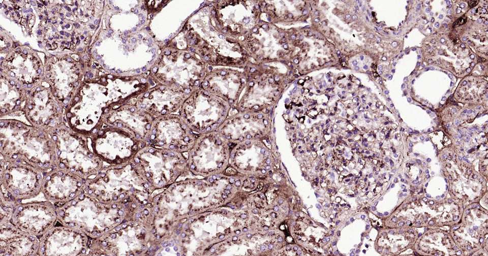 Immunohistochemical analysis of paraffin embedded human kidney tissue slide using IHC0392H (Human Apolipoprotein E Kit).