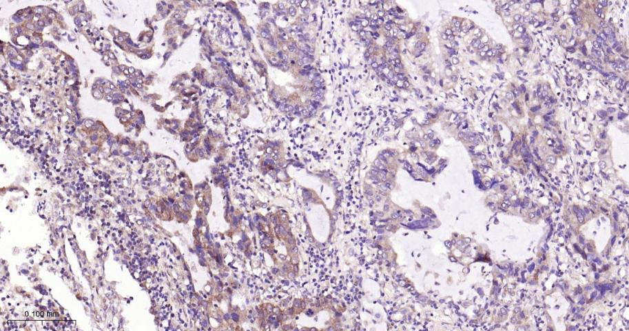 Paraformaldehyde-fixed, paraffin embedded Human Lung Cancer; Antigen retrieval by boiling in sodium citrate buffer (pH6.0) for 15 min; Antibody incubation with AMPK alpha 1 Monoclonal Antibody, Unconjugated(bsm-63119R) at 1:200 overnight at 4°C, followed by conjugation to the bs-0295G-HRP and DAB (C-0010) staining.