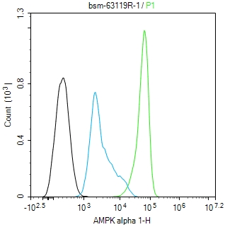 The HepG2 (H) cells were fixed with 4% PFA (10 min at r.t.) and then permeabilized with 90% ice-cold methanol for 20 min at -20℃,the cells then were incubated in 5%BSA to block non-specific protein-protein interactions (30 min at r.t.).Primary Antibody (green):Rabbit Anti-AMPK alpha 1 antibody (bsm-63119R,1:100); Secondary Antibody (white blue): Goat anti-Rabbit IgG-BF488 (bs-60295G-BF488): 1 μg/test. Blank control (black): PBS. Acquisition of 20,000 events was performed.