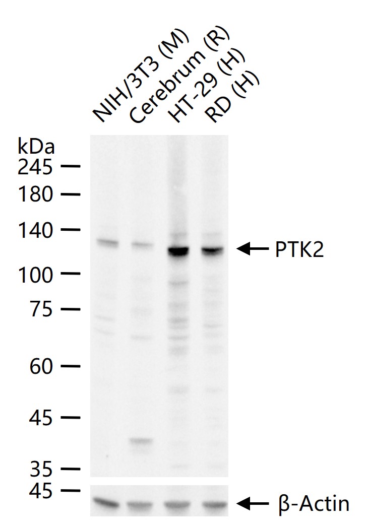 25 ug total protein per lane of various lysates (see on figure) probed with PTK2 monoclonal antibody, unconjugated (bsm-63128R) at 1:1000 dilution and 4°C overnight incubation. Followed by conjugated secondary antibody incubation at r.t. for 60 min.