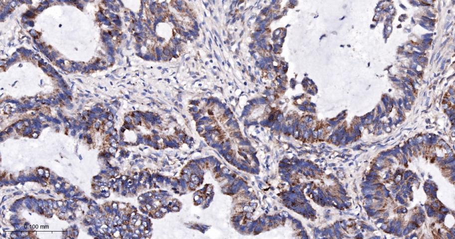 Paraformaldehyde-fixed, paraffin embedded Human Colon Cancer; Antigen retrieval by boiling in sodium citrate buffer (pH6.0) for 15 min; The section was incubated with FAK Monoclonal Antibody, Unconjugated (bsm-63128R) at 1:200 overnight at 4°C, followed by conjugation to the bs-0295G-HRP and DAB (C-0010) staining.