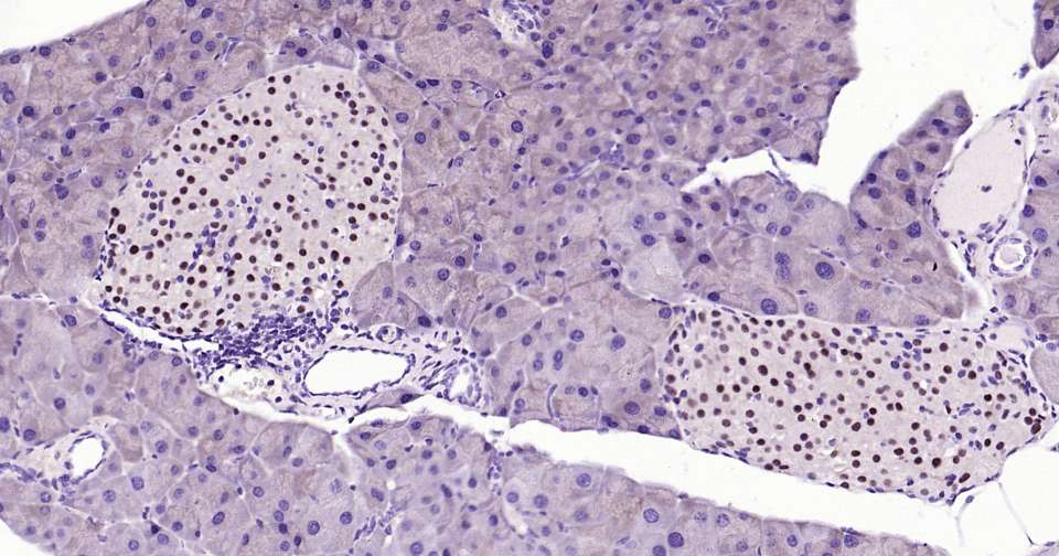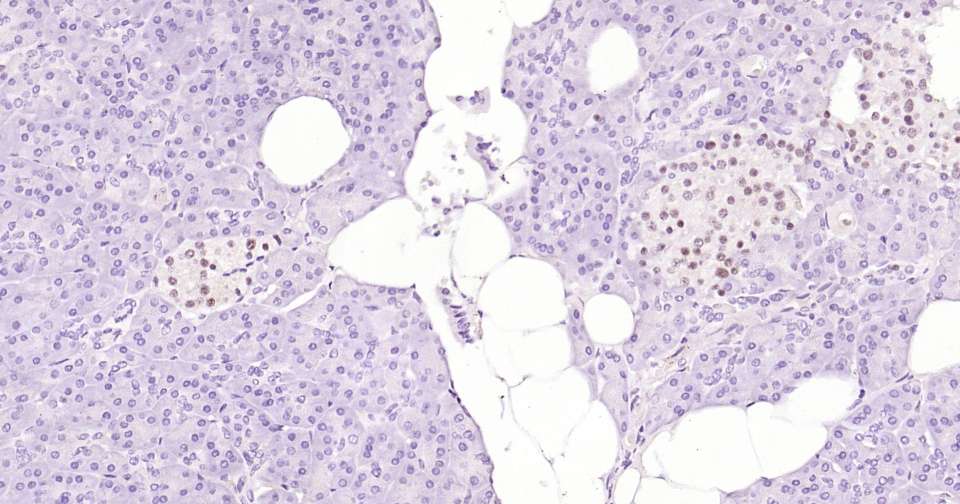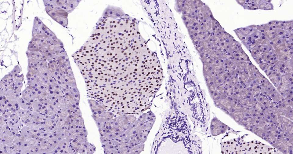 Immunohistochemical analysis of paraffin embedded human pancreas tissue slide using IHC0367 (PAX6 Kit).