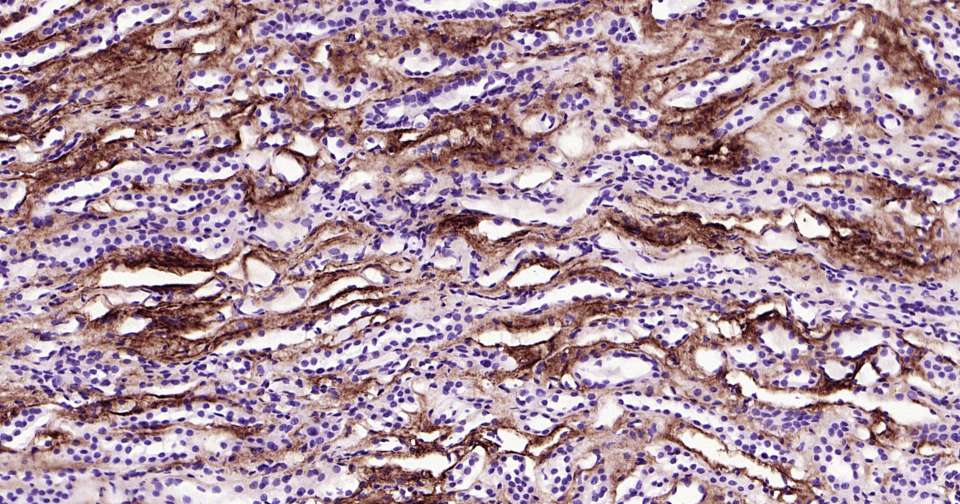 Immunohistochemical analysis of paraffin embedded human kidney tissue slide using IHC0369H (Human Tenascin Kit).