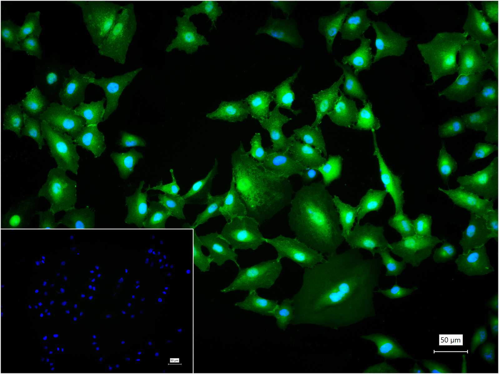 4% Paraformaldehyde-fixed A549 (H) cell; Triton X-100 at r.t. for 20 min; Antibody incubation with (ANX1) polyclonal Antibody, unconjugated (bs-42584R) 1:100, 90 min at 37°C; followed by BF488 conjugated Goat Anti-Rabbit IgG antibody (green, bs-60295G-BF488) at 37°C for 90 min, DAPI (blue, C02-04002) was used to stain the cell nuclei. PBS instead of the primary antibody was used as the blank control.