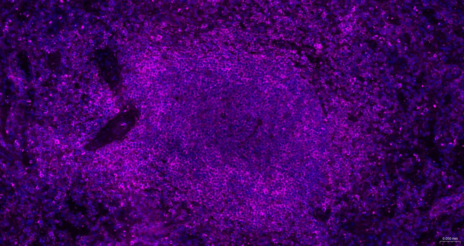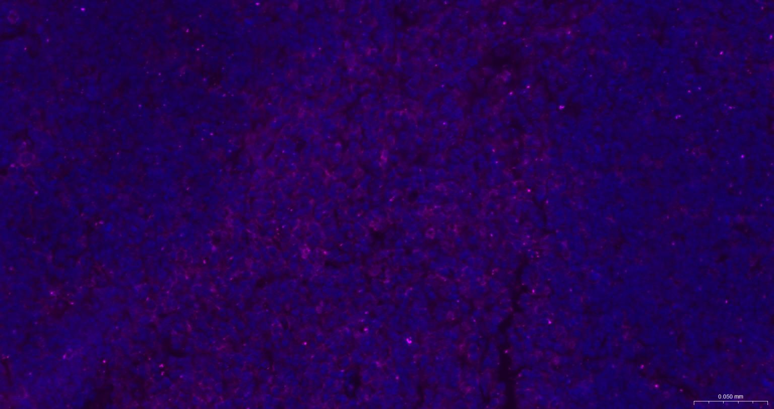 Paraformaldehyde-fixed, paraffin embedded Human Spleen; Antigen retrieval by boiling in sodium citrate buffer (pH6.0) for 15 min; Incubation: CD44 Antibody, conjugated (bsm-54767R-BF647) at 1:200 overnight at 4°C; DAPI (blue, C02-04002) was used to stain the cell nuclei.