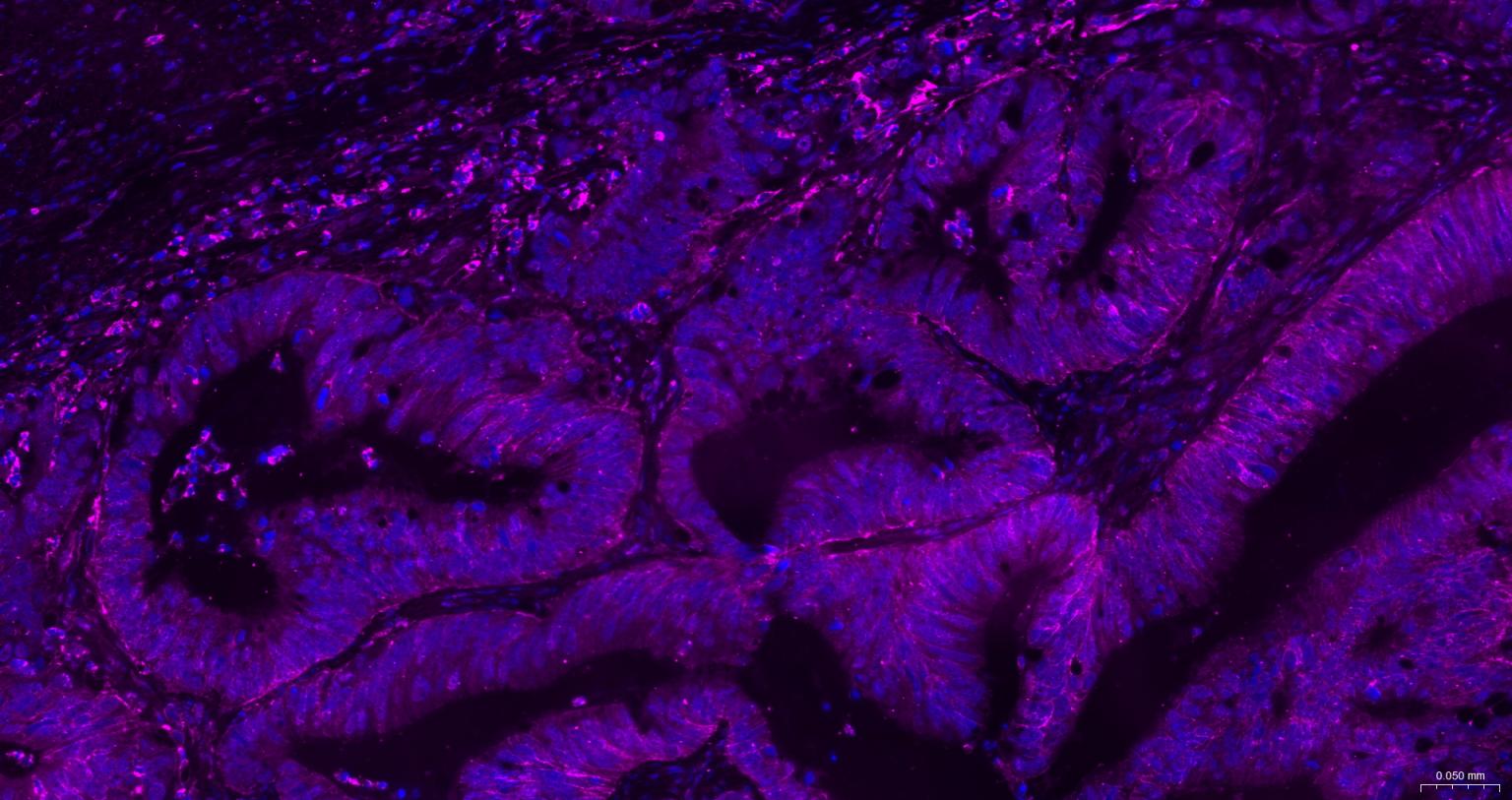 Paraformaldehyde-fixed, paraffin embedded Human Colon Cancer; Antigen retrieval by boiling in sodium citrate buffer (pH6.0) for 15 min; Incubation: CD44 Antibody, conjugated (bsm-54767R-BF647) at 1:200 overnight at 4°C; DAPI (blue, C02-04002) was used to stain the cell nuclei.