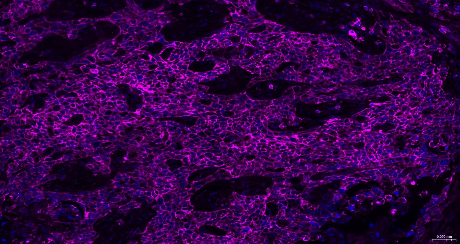 Paraformaldehyde-fixed, paraffin embedded Human Esophageal Cancer; Antigen retrieval by boiling in sodium citrate buffer (pH6.0) for 15 min; Incubation: CD44 Antibody, conjugated (bsm-54767R-BF647) at 1:200 overnight at 4°C; DAPI (blue, C02-04002) was used to stain the cell nuclei.