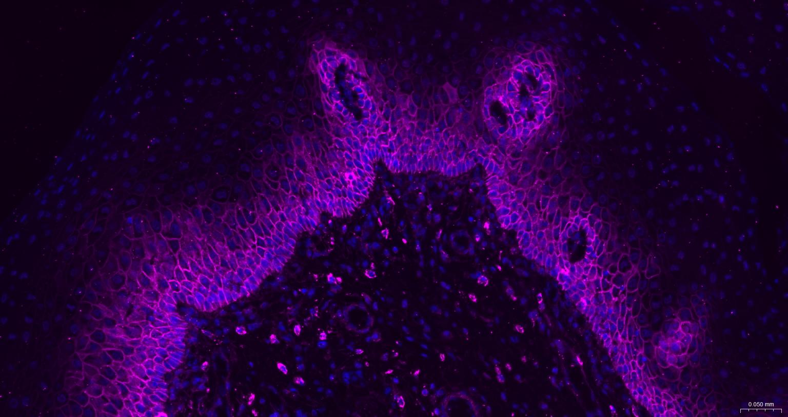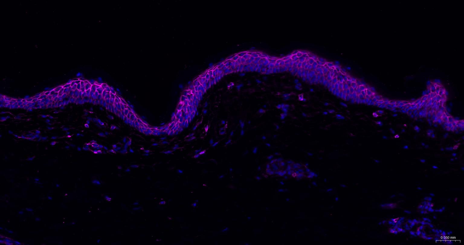 Paraformaldehyde-fixed, paraffin embedded Human Skin; Antigen retrieval by boiling in sodium citrate buffer (pH6.0) for 15 min; Incubation: CD44 Antibody, conjugated (bsm-54767R-BF647) at 1:200 overnight at 4°C; DAPI (blue, C02-04002) was used to stain the cell nuclei.